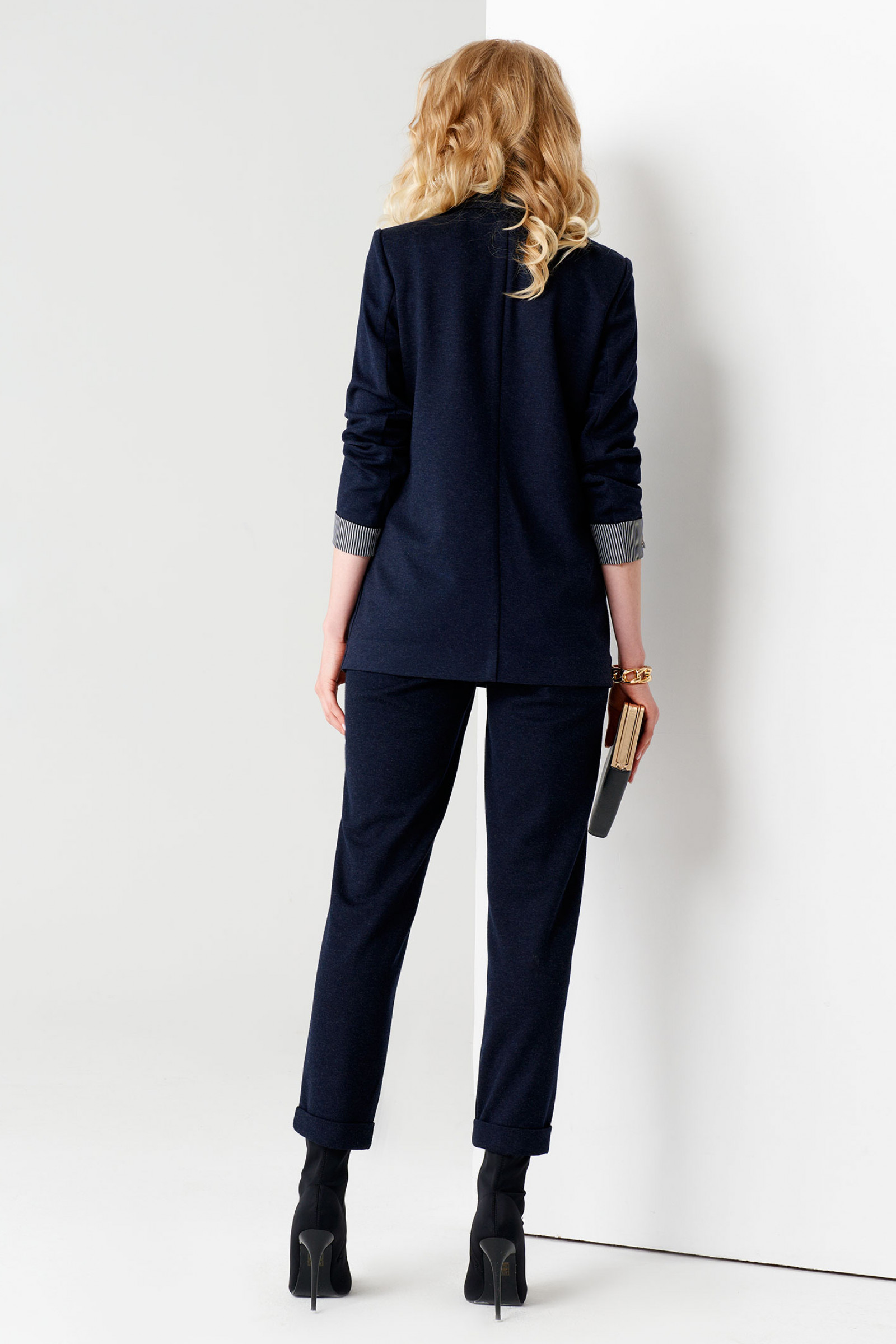 Очень стильный удлинённый жакет выполнен из плотного и приятного на ощупь ,эластичного трикотажного полотна. Рукав втачной длинный.Снизу обтачен подкладочной тканью с принтом в тонкую полосочку.Низ рукава можно отвернуть ,как манжет. Воротник отложной пиджачного типа. Застёжка спереди на две пуговицы. Спереди выполнены прорезные карманы с листачкой. По спинке выполнен средний шов. Жакет без подкладки и максимально комфортен в эксплуатации. Идеально подходит как вариант на каждый день и в офис для предприимчивой и активной девушки,предпочитающей стильные и практичные вещи.