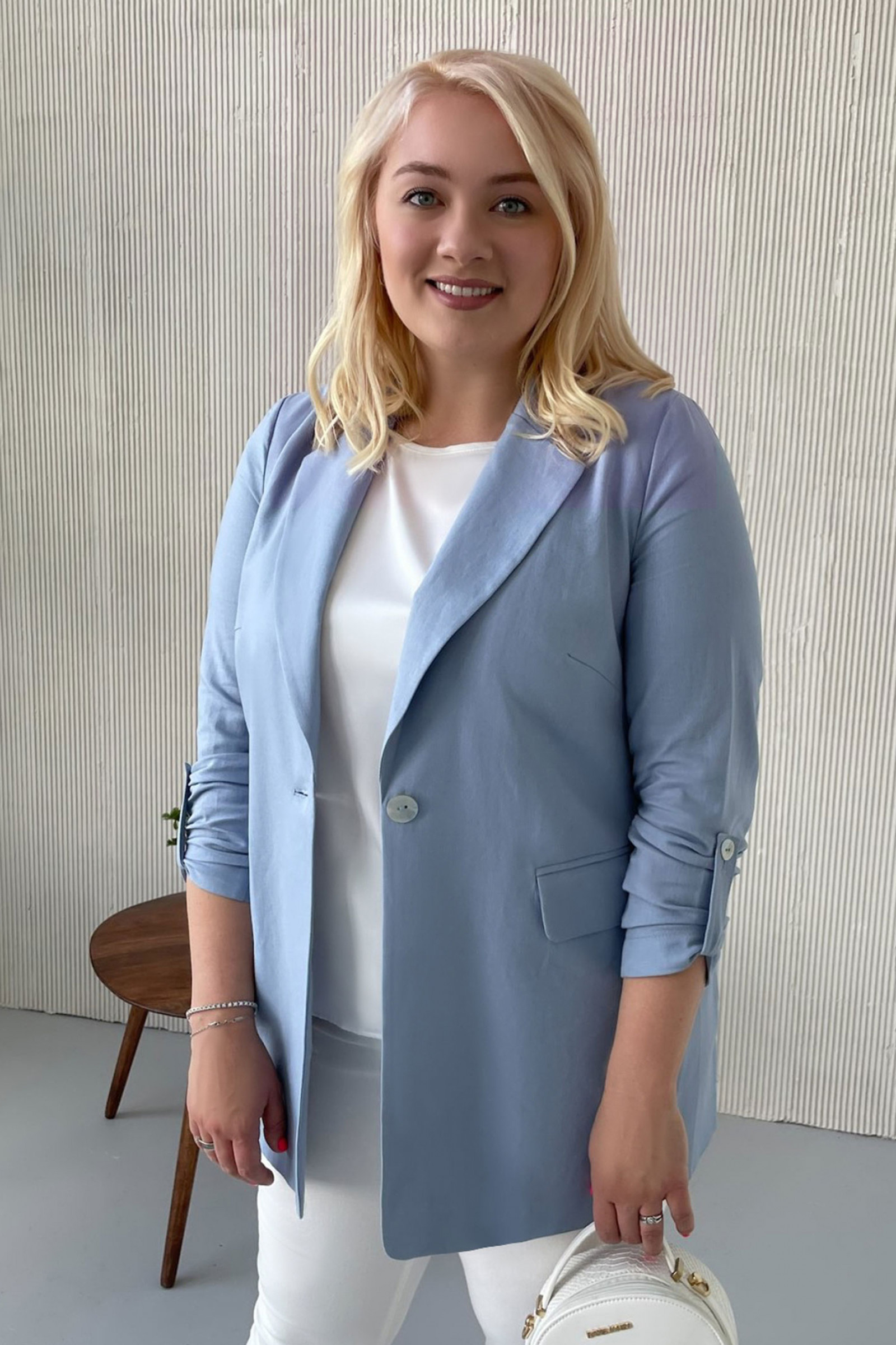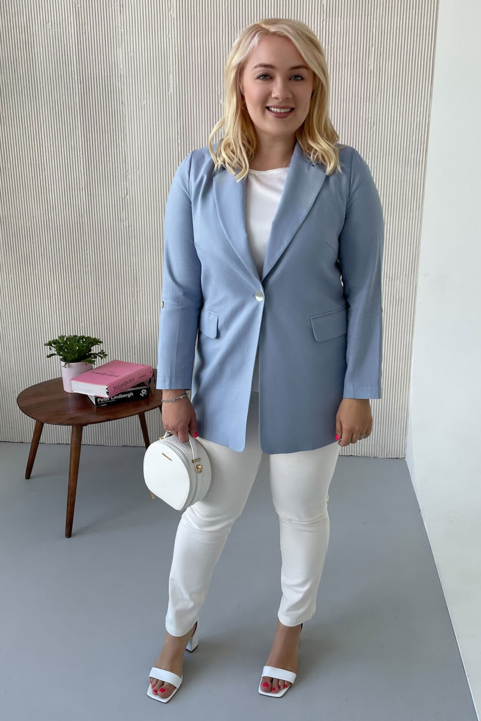 Удлиненный пиджак женский идеально дополнит повседневный кэжуал или деловой стиль. Двубортный отложной воротник формирует красивую линию декольте. Впереди трикотажный жакет женский застегивается на одну пуговицу. Его можно надеть поверх блузки, футболки, майки, сочетать с брюками, джинсами, легинсами, бриджами. Жакет с рукавом ¾ подарят вам комфорт в пасмурный день или летний вечер. Будет актуален на торжественном мероприятии и обычной прогулке. Вы можете купить женский летний жакет в размерах 50-58.