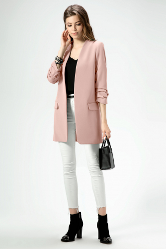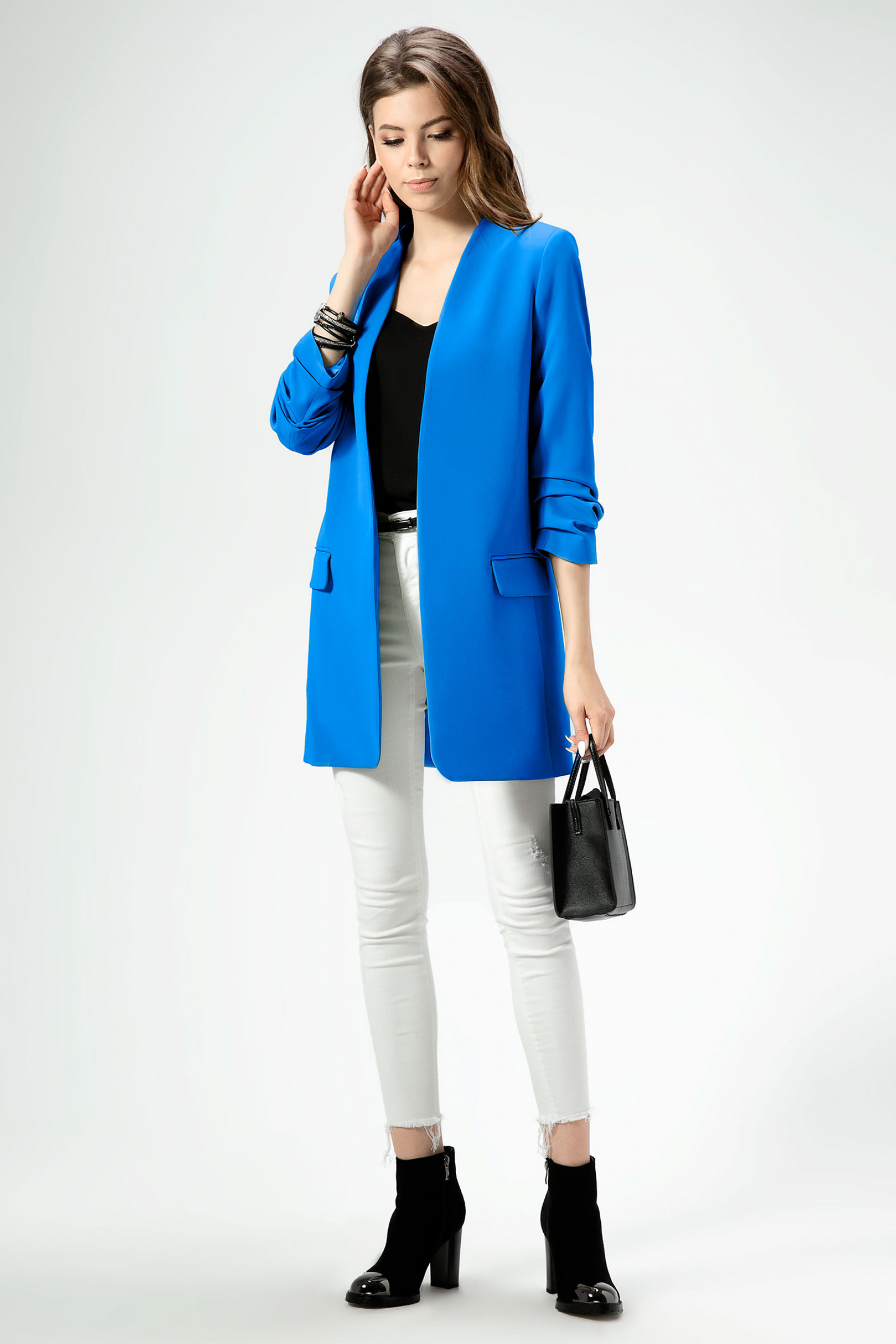 Стильный модный жакет в стиле "кэжуал". Это повседневный удобный и практичный жакет, который отлично сочетается как с джинсами, так и с брюками. Жакет удлиненный, без застежки, рукава длиной ниже локтя. По переду имеются карманы. Спинка со средним швом, который заканчивается шлицей. Жакет на подкладки.