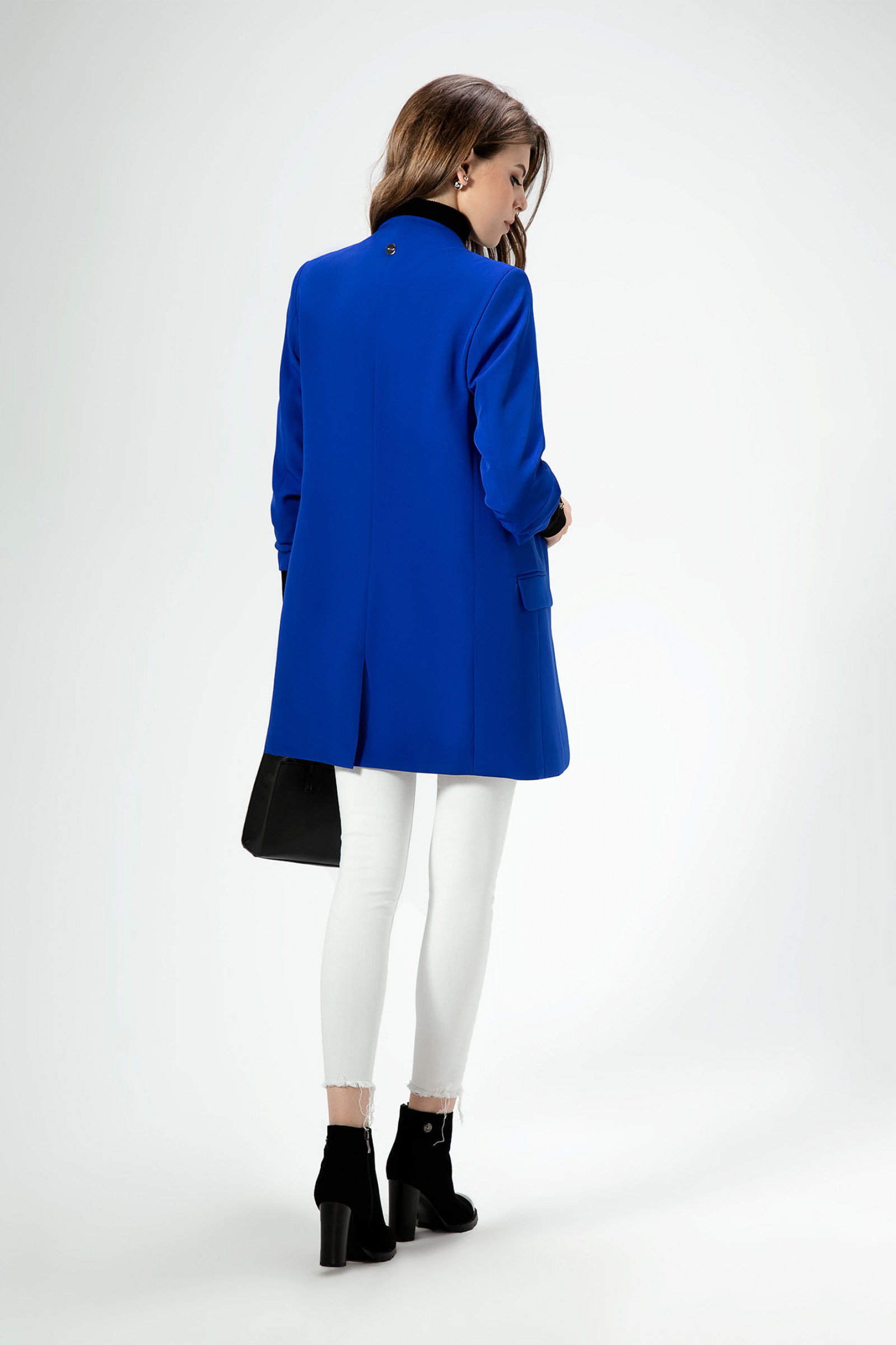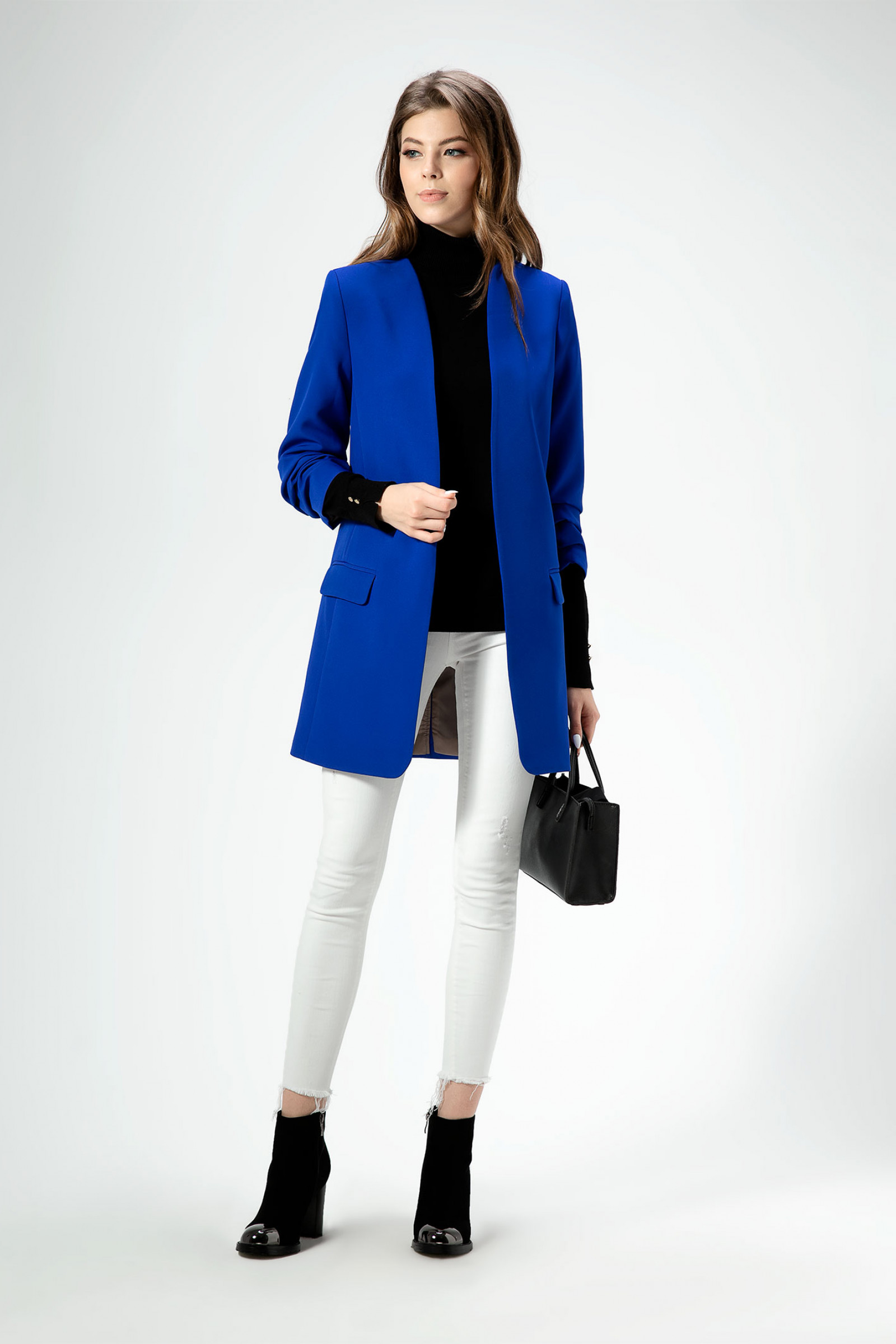 Стильный модный жакет в стиле "кэжуал". Это повседневный удобный и практичный жакет, который отлично сочетается как с джинсами, так и с брюками. Жакет удлиненный, без застежки, рукава длиной ниже локтя. По переду имеются карманы. Спинка со средним швом, который заканчивается шлицей. Жакет на подкладки.