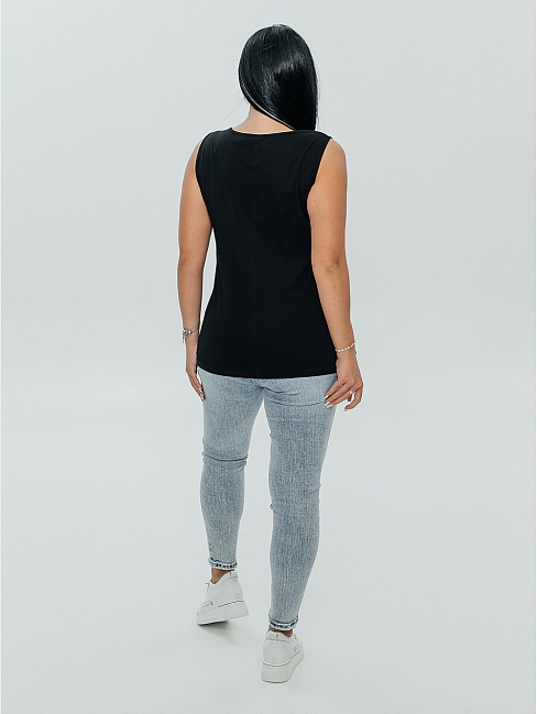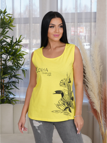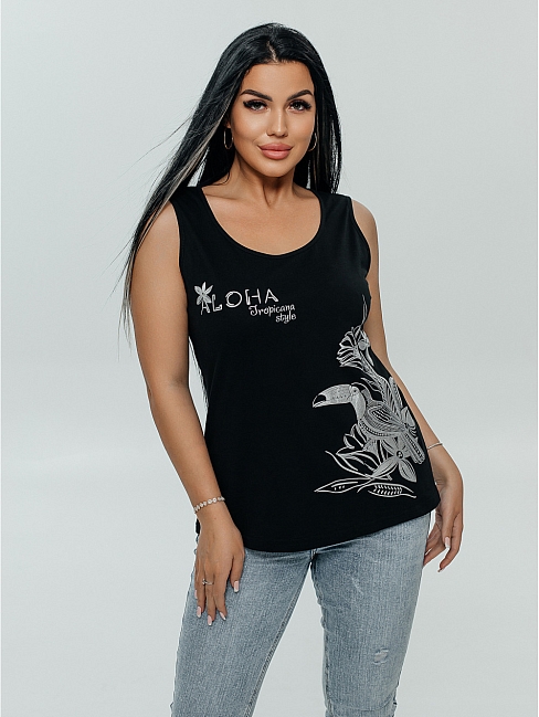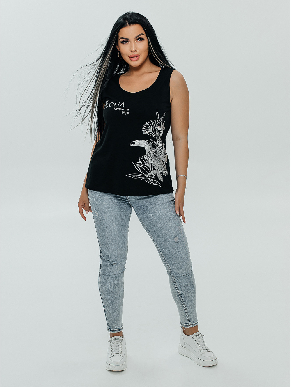 Майка женская БАЛИ на широких бретелях. Полочка украшена принтом. Идеальный выбор под жакеты, джемпера.