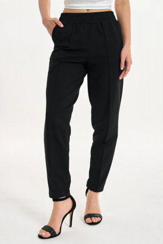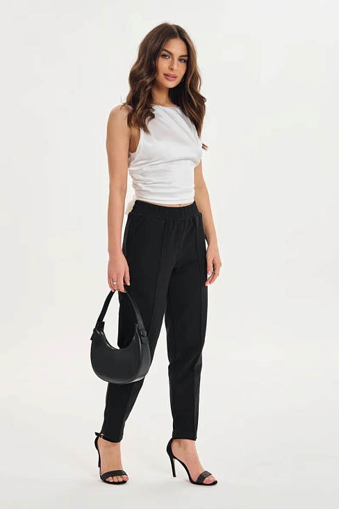 Классические женские брюки бананы имеют эластичный пояс на резинке, боковые карманы с отрезным бочком, элегантную прострочку по центру штанин, которая визуально удлиняет ноги. Благодаря высокой посадке легкие брючки помогают создать женственный силуэт. Строгие укороченные бриджи не скатываются и не линяют, держат форму и не мнутся, а колени не вытягиваются даже спустя время.