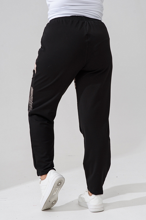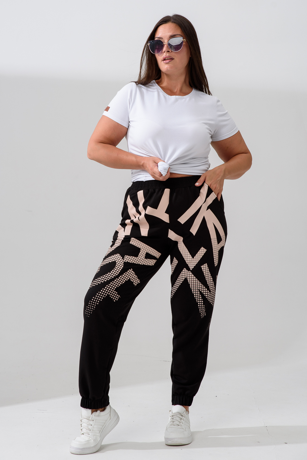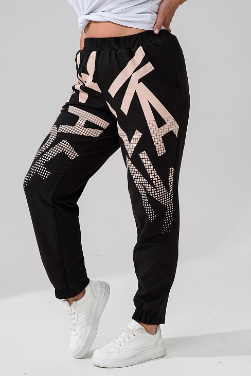 Брюки женские, свободные по бедрам, зауженные к низу. Спереди внутренние карманы, низ  передней части брюк собран на эластичную ленту. Пояс выполнен на многоигольной машине. На передней и задней частях брюк принт. Идеальны для повседневной носки.