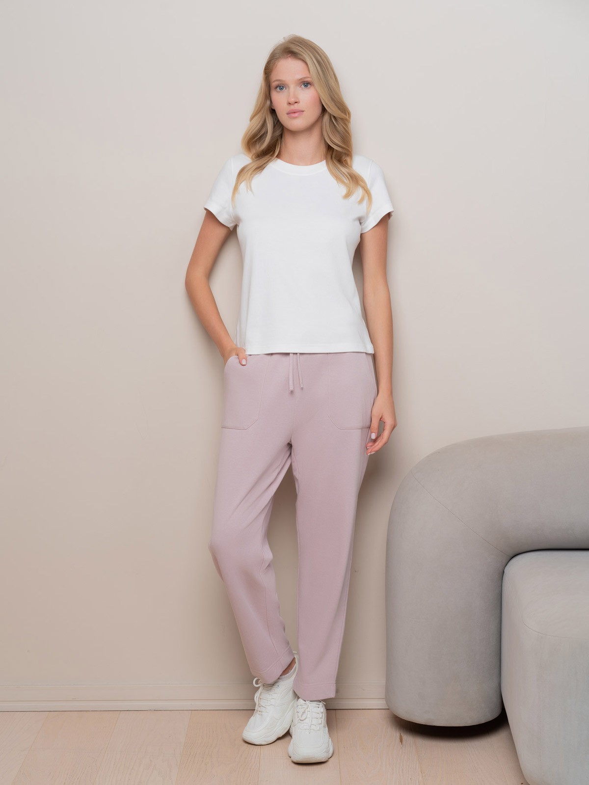 Брюки из мягкой смеси хлопка и полиэстера обеспечивают комфорт и легкость в уходе, оставаясь долговечными и приятными к телу.  Благодаря широкой эластичной резинке брюки надежно сидят на талии, а регулирующий шнурок позволяет адаптировать посадку под индивидуальные предпочтения.  Прямой крой обеспечивает свободу движений, делая брюки подходящими как для дома, так и для активного отдыха.