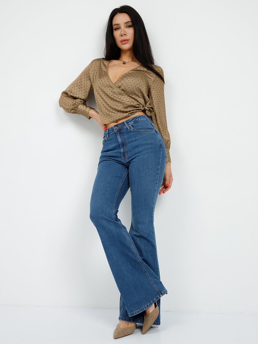 Женские джинсы с пятью карманами. Посадка Slim flare fit (облегающие по бедру и расклешенные от колена), высокая талия. Для улучшения посадки по талии сделан подкройной пояс из 2-х частей. Застежка на молнии. Выполнены из слабоэластичной ткани denim stretch, Средняя стирка ссо слабовыраженными потёртостями и "усами" спереди и потёртостями сзади.Параметры указаны для размера 28. Длина внутреннего шва - 82,5 см.