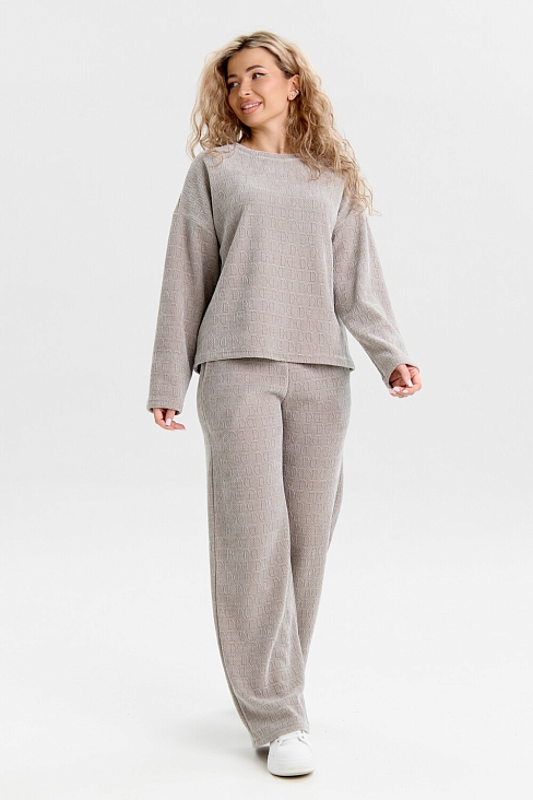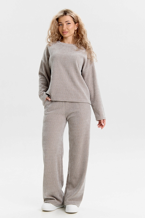 Женский костюм выполнен из жаккарда высокого качества. Жаккард - высокотехнологичный материал, прошедшей особую обработку. Ткань отличается высокими теплозащитными свойствами, при этом является дышащей. По своим характеристикам она не уступает шерстяным полотнам. И даже в сыром состоянии удерживает тепло у тела.  Материал прочный, эластичный, влагостойкий. Воздухопроницаемая гигроскопичная ткань создает для тела комфортный микроклимат. Изделия из жаккарда легкие, не мнутся, не деформируются, не вытягиваються.В такой одежде удобно и комфортно. Эластичность материала позволяет легко двигаться. Костюм состоит из лонгслива и брюк. Лонг в стиле OVERSIZE ( одежда свободного кроя ) - это свобода самовыражения, позволяющая чувствовать себя комфортно и стильно одновременно. Горловина свитшота выполнена с обтачкой. Линия плеча спущена, длинный рукав. Женские стильные брюки - трубы представлены с вместительными боковыми карманами. Пояс выполнен на специализированной круговой поясной машине, что делает швы ровными и качественными. А профессиональные закрепки на поясе, придают изделию законченный вид и качество. Свободный крой прекрасно будет смотреться на дамах с любыми формами. Костюм такого плана представлен в широкой размерной сетке, что позволяет выбрать его как девушке, так и женщине. Костюм модных расцветок, будет удачным выбором для поездок в отпуск, на пикник, для школы, для активного отдыха и прогулок по городу. Будет гармонично сочетаться как с кроссовками, так и с ботинками. Используя эту модель в качестве домашнего костюма, Вы поймёте, что это именно тот самый идеальный вариант, в котором  будете себя чувствовать удобно, комфортно и современно. Костюм с брюками - это настоящая находка для тех, кто ценит свою индивидуальность!