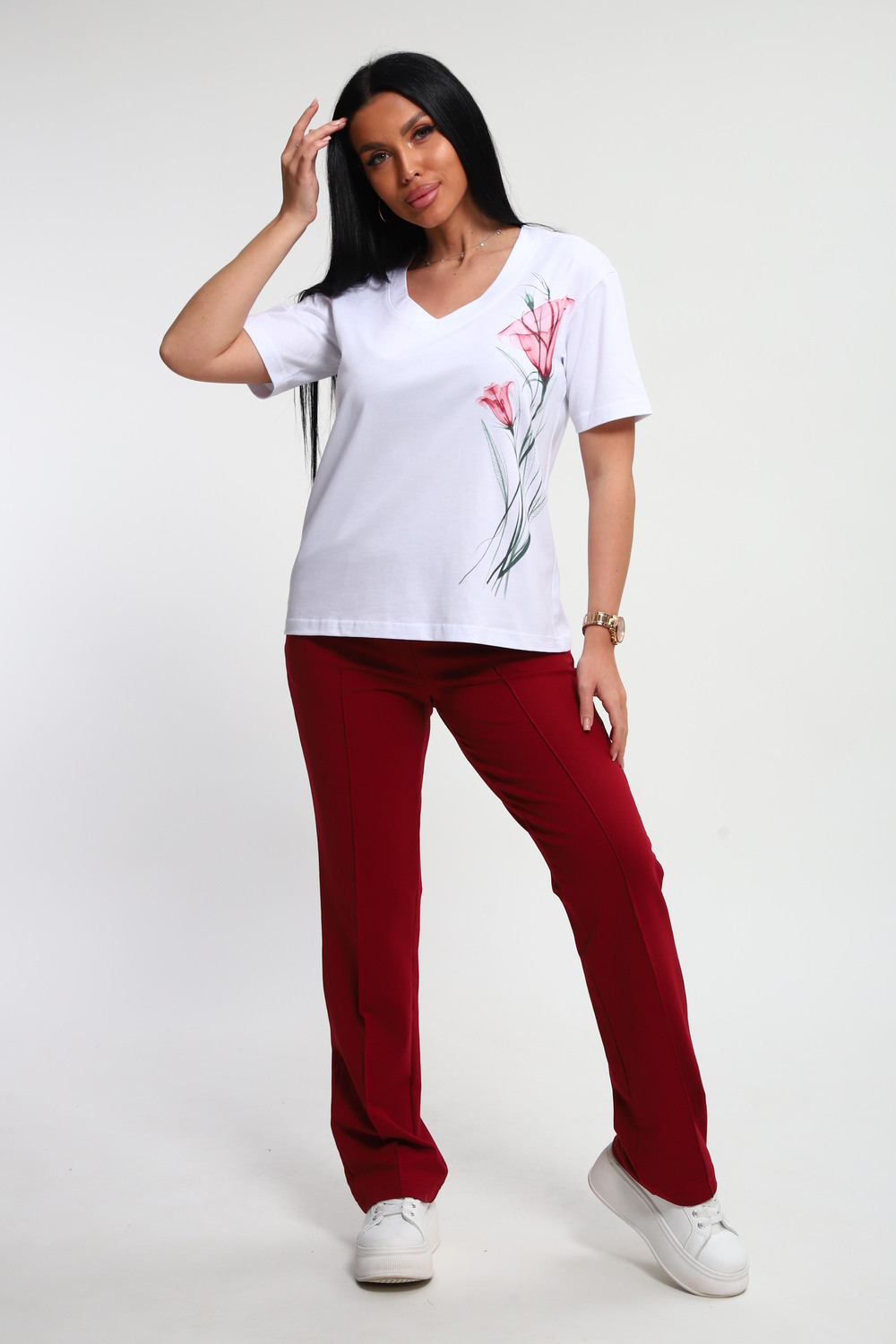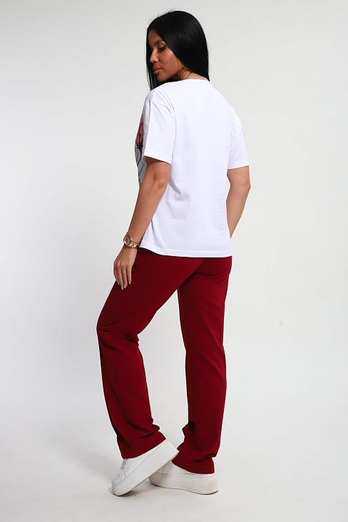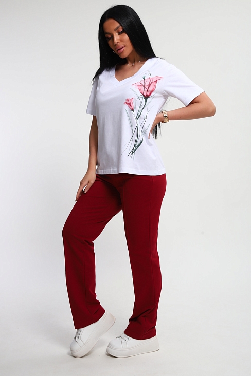 Костюм женский – это стильный и идеальный предмет гардероба ,идеально подходящий для дома и отдыха на любой период :весенний ,осенний, летний и зимний . Комплект состоит из футболки с красочным принтом и брюки в контрастном цвете. В составе ткани 100% хлопок . Хлопковый материал очень комфортный и лёгкий в носке . Брюки  с удобной посадкой придадут  вашему образу стильный и модный вид . Базовый современный костюмчик – популярный повседневный выбор на каждый день : на работу , для прогулок , праздников и на дачу . Универсальный стиль позволит вам создавать разнообразные образы , подходящие для любого события.