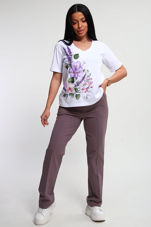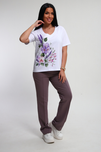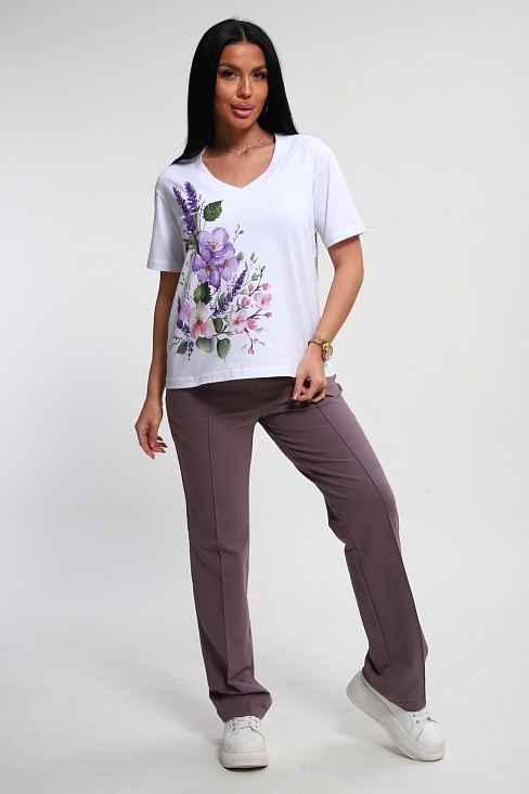 Костюм женский – это стильный и идеальный предмет гардероба ,идеально подходящий для дома и отдыха на любой период :весенний ,осенний, летний и зимний . Комплект состоит из футболки с красочным принтом и брюки в контрастном цвете. В составе ткани 100% хлопок . Хлопковый материал очень комфортный и лёгкий в носке . Брюки  с удобной посадкой придадут  вашему образу стильный и модный вид . Базовый современный костюмчик – популярный повседневный выбор на каждый день : на работу , для прогулок , праздников и на дачу . Универсальный стиль позволит вам создавать разнообразные образы , подходящие для любого события.