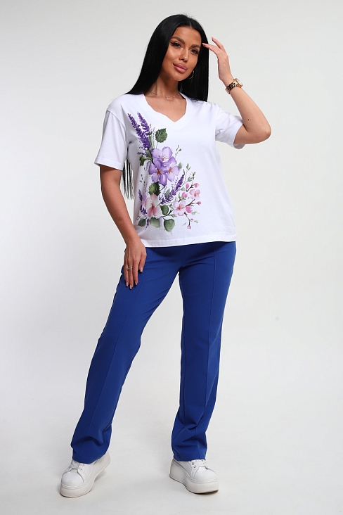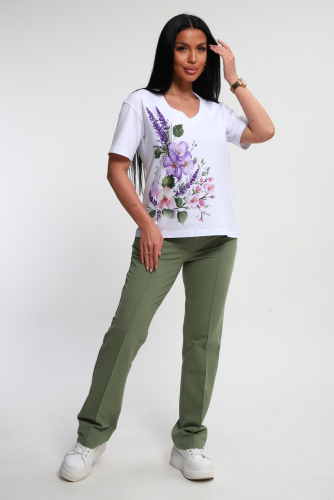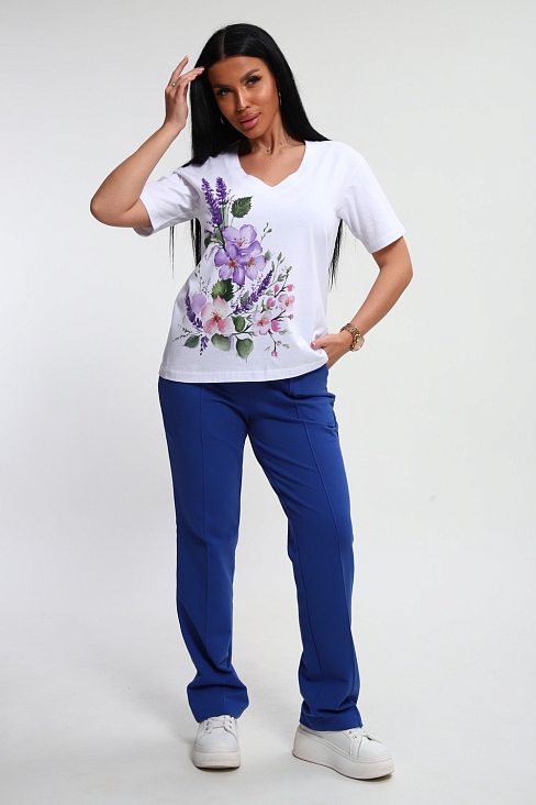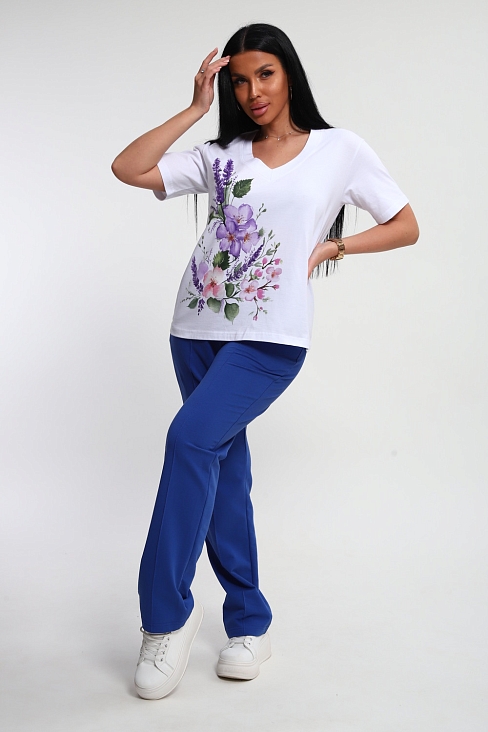 Костюм женский – это стильный и идеальный предмет гардероба ,идеально подходящий для дома и отдыха на любой период :весенний ,осенний, летний и зимний . Комплект состоит из футболки с красочным принтом и брюки в контрастном цвете. В составе ткани 100% хлопок . Хлопковый материал очень комфортный и лёгкий в носке . Брюки  с удобной посадкой придадут  вашему образу стильный и модный вид . Базовый современный костюмчик – популярный повседневный выбор на каждый день : на работу , для прогулок , праздников и на дачу . Универсальный стиль позволит вам создавать разнообразные образы , подходящие для любого события.