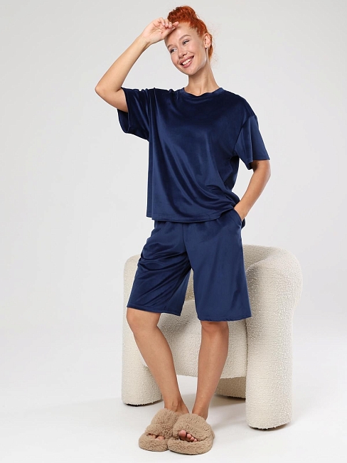 Женский велюровый костюм с шортами. Костюм состоит из свободной футболки и шорт, выполненных из мягкого велюра. Этот материал приятен на ощупь, хорошо сохраняет тепло и подходит для домашнего отдыха или сна.