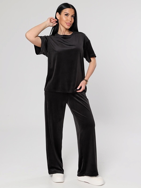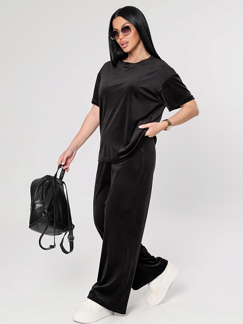 Женский велюровый костюм, состоящий из свободного свитшота и брюк прямого кроя. Костюм выполнен из мягкого велюра, что делает его комфортным для повседневной носки, прогулок или домашнего отдыха.