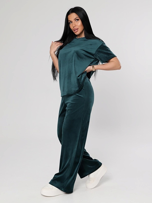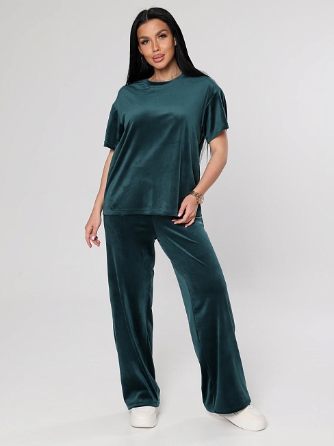 Женский велюровый костюм, состоящий из свободного свитшота и брюк прямого кроя. Костюм выполнен из мягкого велюра, что делает его комфортным для повседневной носки, прогулок или домашнего отдыха.