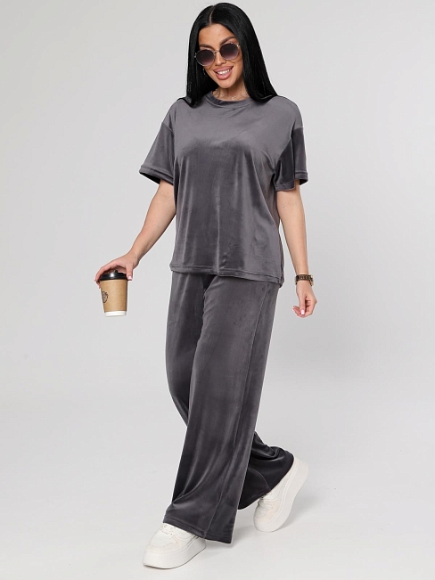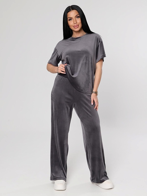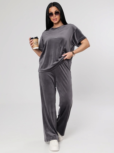 Женский велюровый костюм, состоящий из свободного свитшота и брюк прямого кроя. Костюм выполнен из мягкого велюра, что делает его комфортным для повседневной носки, прогулок или домашнего отдыха.