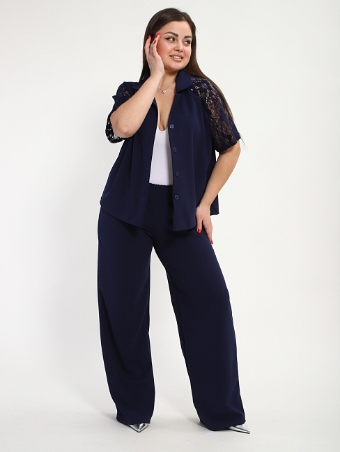 Женский костюм с брюками из крепа с кружевом — это сочетание элегантности и текстуры. Креп обеспечивает прочность и форму, а кружево добавляет романтичности и декоративности. Такие костюмы могут использоваться для вечерних выходов, деловых мероприятий или в качестве акцентного элемента гардероба.