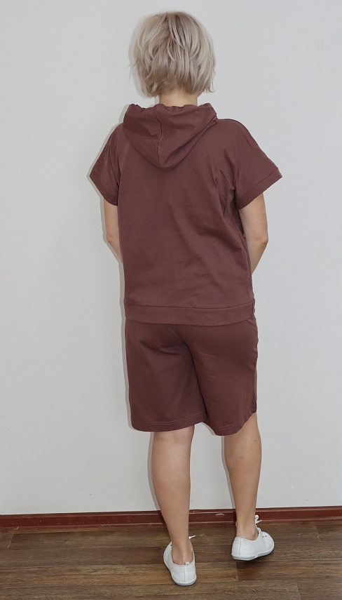 из футболки с короткими рукавами и капюшоном и свободных шорт-бермудов. Отшитый