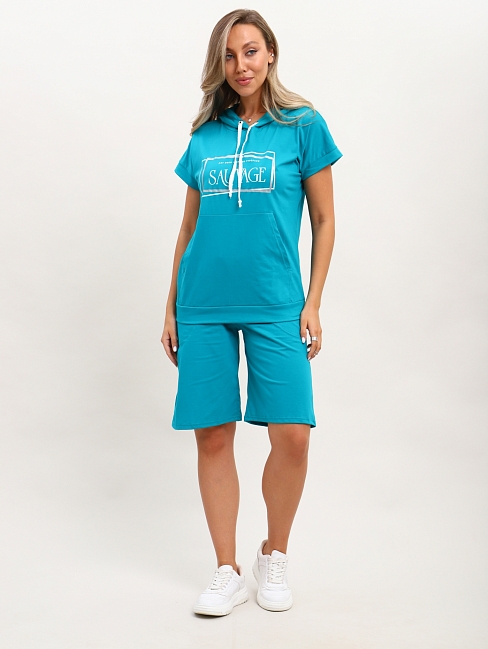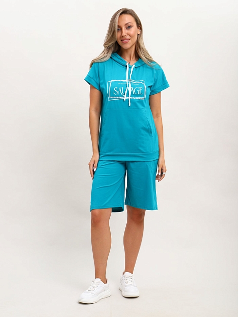 из футболки с короткими рукавами и капюшоном и свободных шорт-бермудов. Отшитый