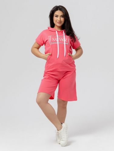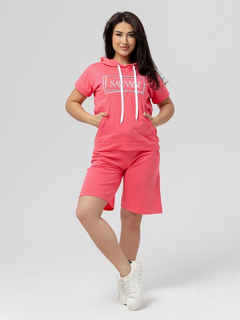 из футболки с короткими рукавами и капюшоном и свободных шорт-бермудов. Отшитый из хлопковой