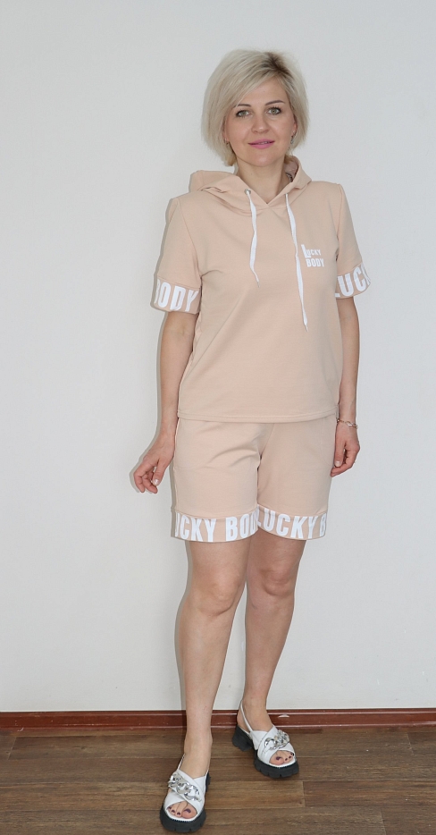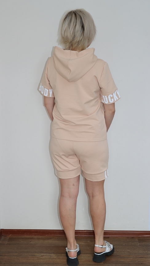 из толстовки с короткими рукавами и шорт, отшивается из хлопковой ткани футера