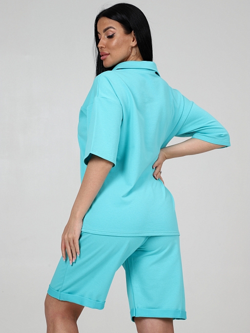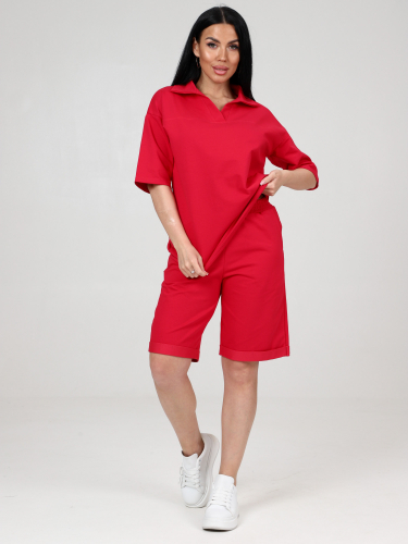 Женский костюм из мягкого трикотажа. Комплект состоит из футболки-поло с короткими рукавами и воротником-стойкой, а также удлиненных шорт. Удобный, практичный, с хорошей воздухопроницаемостью.