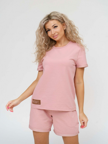 Молодежный летний костюм мод.1492 / Пудровый из футера 2-х нитки. Свободная футболка с втачным рукавом и О-образной горловиной. Короткие свободные шорты с карманами. Костюм отлично подойдет для летних прогулок и занятий спортом.