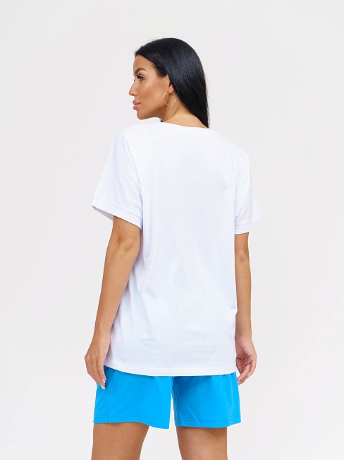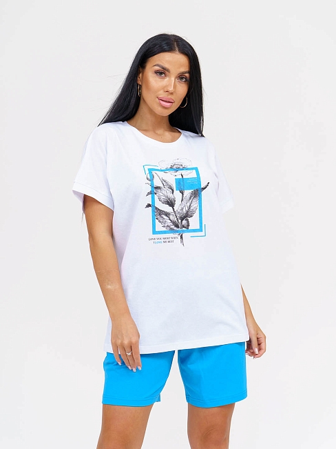 Легкий и стильный хлопковый костюм мод.1909/2 / Голубой - идеальный выбор для повседневного летнего образа! Шорты в нежном голубом цвете и футболка в ярком белом оттенке с принтом на груди создадут неповторимый легкий и свежий летний образ. Комфорт и стиль в одном наборе!