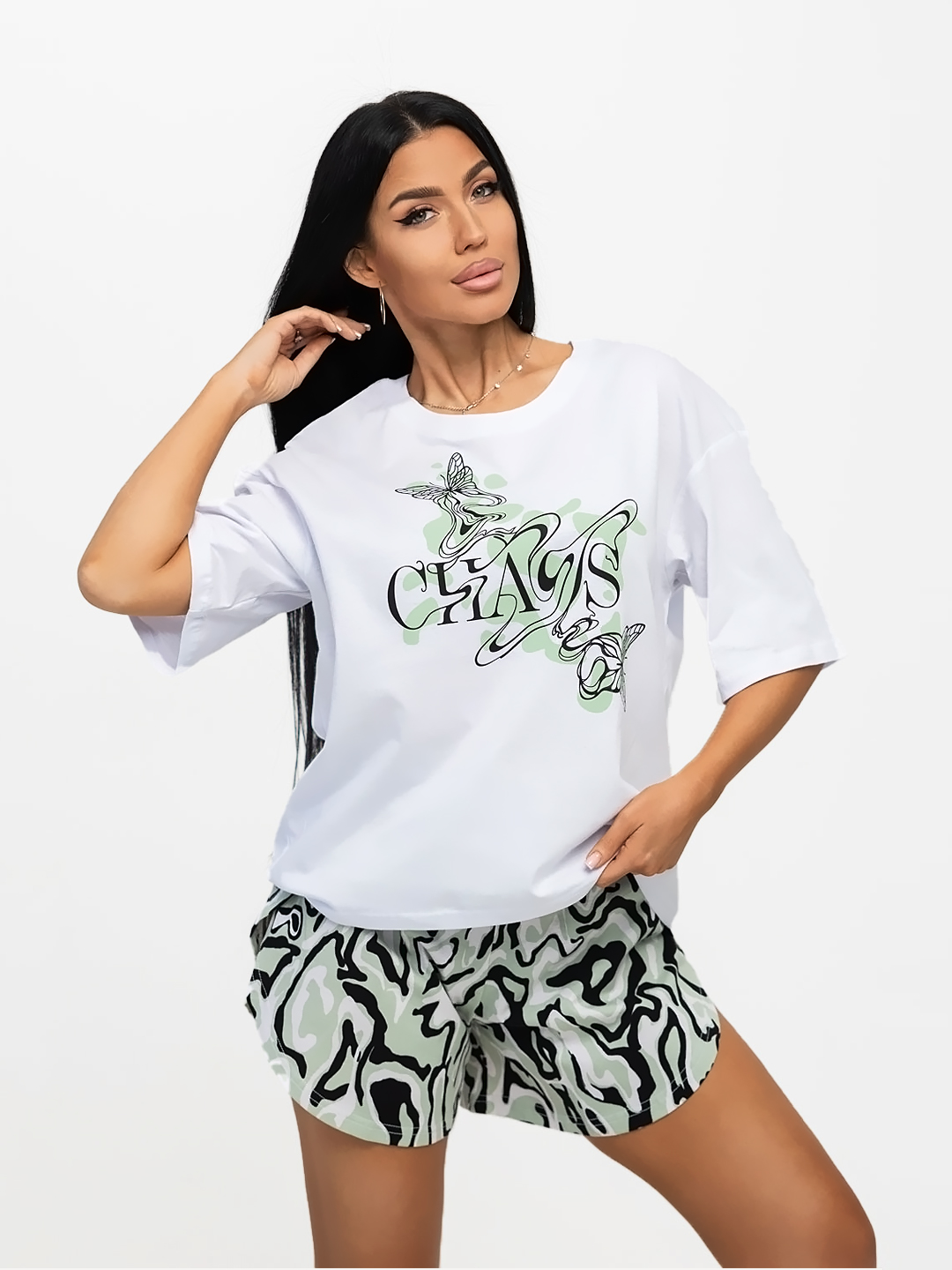 Костюм женский шорты и футболка мод.1975/5 / Зеленый. Футболка со спущенным коротким рукавом и округлой горловиной. На полочке и спинке печатный рисунок. Шорты - короткие, свободного силуэта, с поясом на резинке и вырезом в области бокового шва, для идеальной посадки и максимального комфорта.