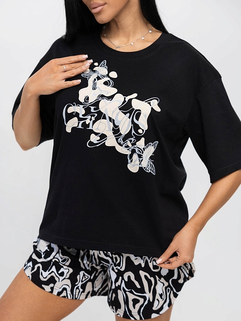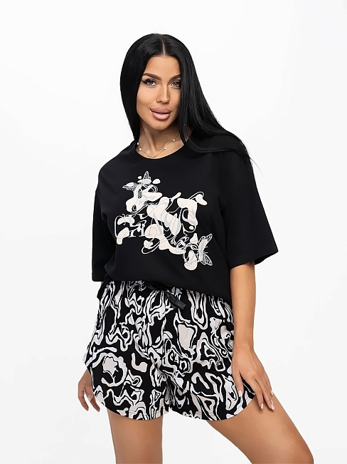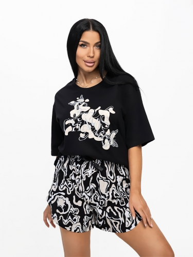 Костюм женский шорты и футболка мод.1975/6 / Черный, бежевый. Футболка со спущенным коротким рукавом и округлой горловиной. На полочке и спинке печатный рисунок. Шорты - короткие, свободного силуэта, с поясом на резинке и вырезом в области бокового шва, для идеальной посадки и максимального комфорта.