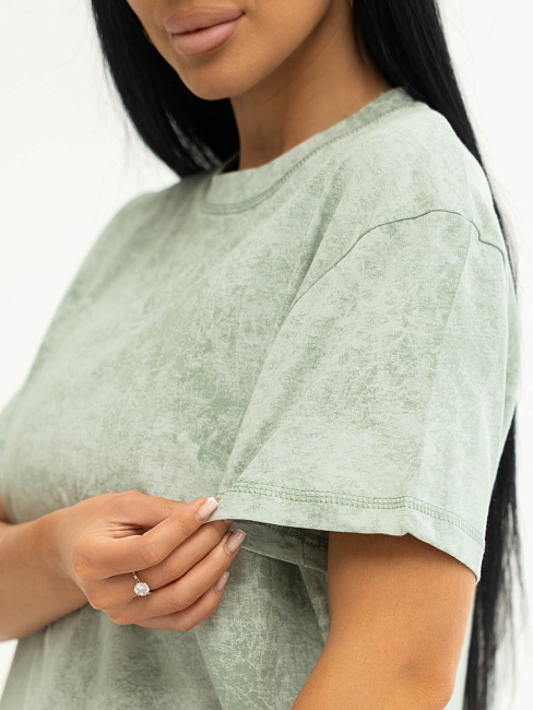 Костюм женский мод.2033/4 / Зеленый свободного силуэта, футболка и шорты. Футболка с коротким спущенным рукавом и округлой горловиной. Шорты с поясом на резинке, для удобной посадки и карманами с отрезным бочком. Яркий современный рисунок ткани в стиле - варенка. Легкий, удобный костюм из натурального хлопка, на каждый день.