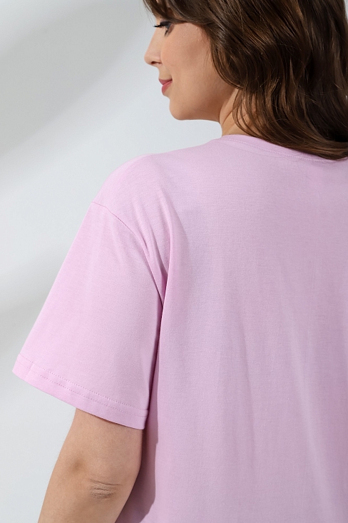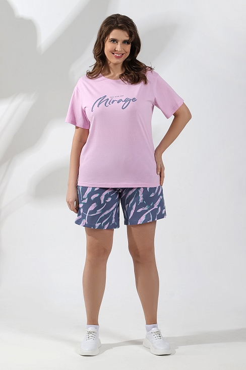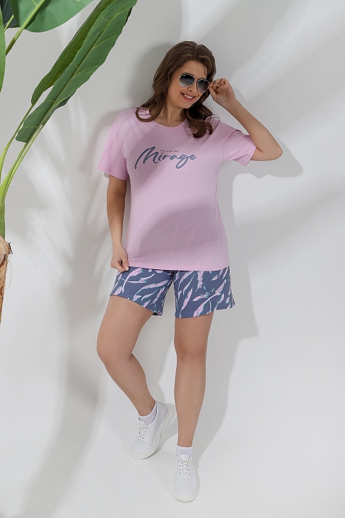 Костюм женский из трикотажного полотна «кулирка» в комбинации двух видов полотен в единой цветовой гамме, состоящий из футболки и шорт. Футболка из гладкокрашеного полотна, свободная, с горловиной овальной формы, обработанной притачной бейкой, с цельнокроеными спущенными рукавами и принтом на полочке, выполненным в технике «шелкографии».Шорты из полотна с набивным рисунком, свободные, с карманами в боковых швах, на притачном поясе с эластичной тесьмой внутри.