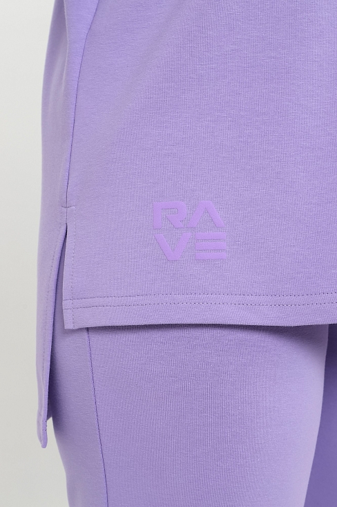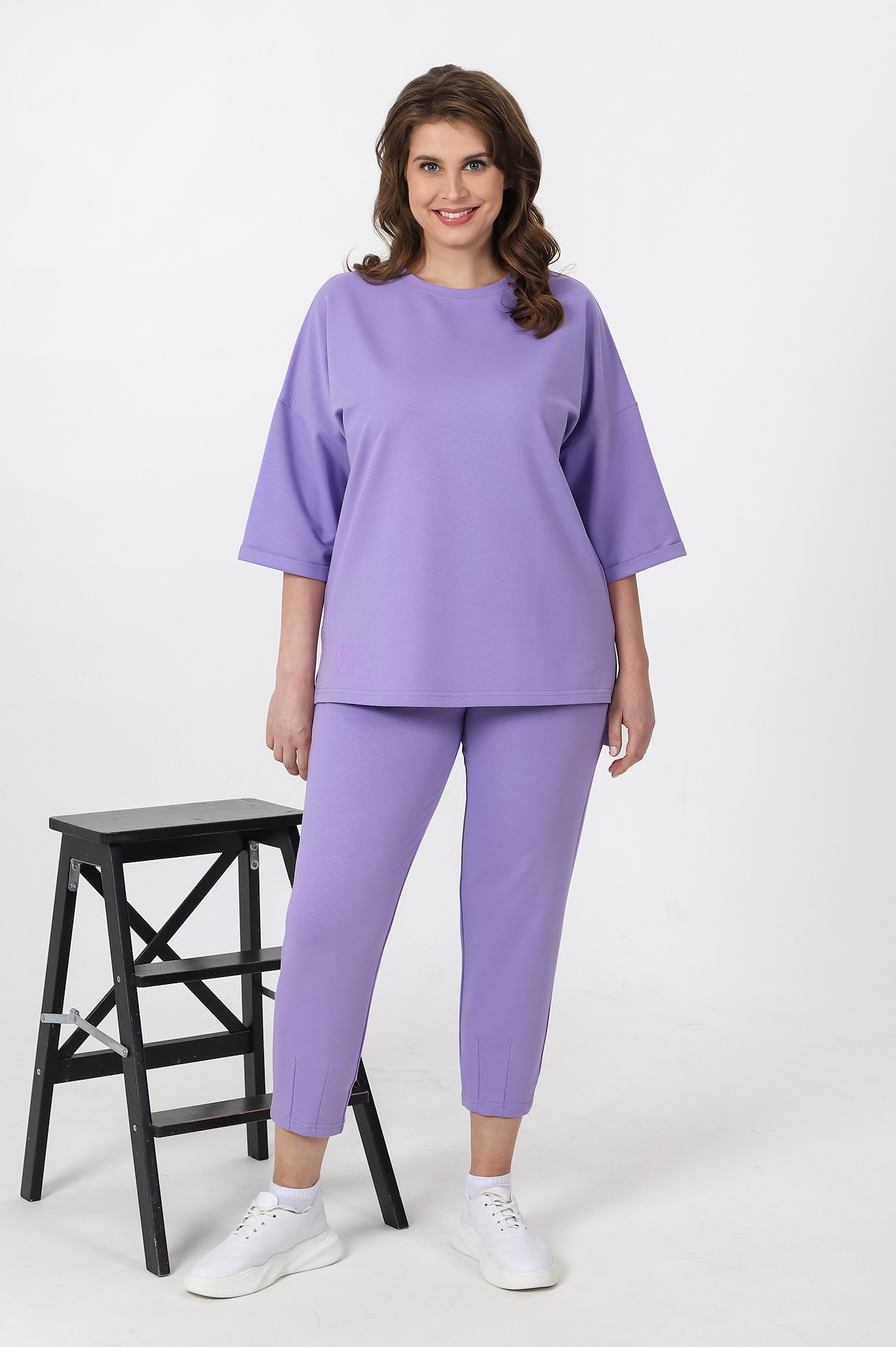 Костюм из гладкокрашеного трикотажного полотна «футер-двунитка», состоящий из джемпера и брюк. Джемпер – свободного покроя, с рукавами на основе цельнокроеных длиной до локтя, горловиной овальной формы, обработанной втачной планкой, разрезами в боковых швах и принтом на полочке. Рукава – с цельнокроеными манжетами-отворотами. Модный элемент- разность длины полочки и спинки на 10 см. Брюки – укороченные, на притачном поясе с эластичной тесьмой внутри и карманами в боковых швах. На нижних частях передних и задних половин обработаны по две вертикальные вытачки.