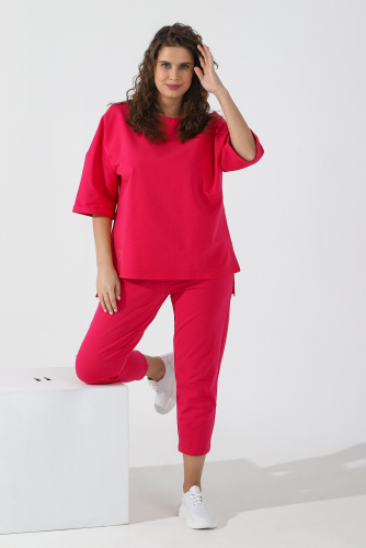 Костюм из гладкокрашеного трикотажного полотна «футер-двунитка», состоящий из джемпера и брюк. Джемпер – свободного покроя, с рукавами на основе цельнокроеных длиной до локтя, горловиной овальной формы, обработанной втачной планкой, разрезами в боковых швах и принтом на полочке. Рукава – с цельнокроеными манжетами-отворотами. Модный элемент- разность длины полочки и спинки на 10 см. Брюки – укороченные, на притачном поясе с эластичной тесьмой внутри и карманами в боковых швах. На нижних частях передних и задних половин обработано по две вертикальные вытачки.