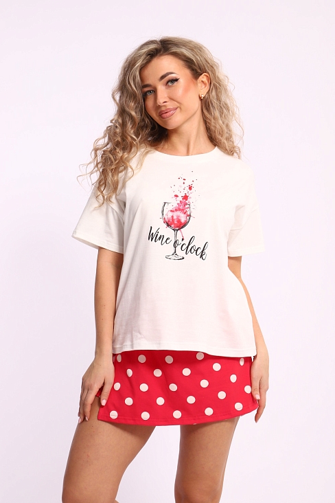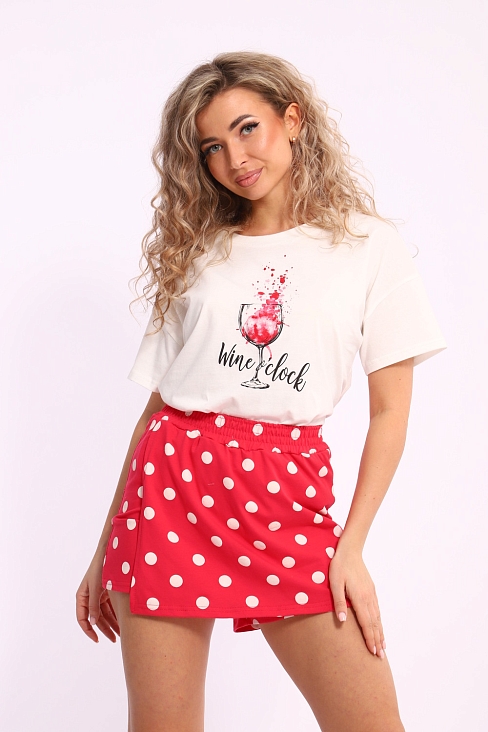 Костюм комбинированный женский, футболка с шортами-юбка. Футболка выполнена из трикотажного полотна кулирка (хлопок 100%), свободного покроя со спущены коротким рукавом. На полочке присутствует принт. Шорты-юбка выполнена из эластичного трикотажного полотна кулирка с лайкрой (хлопок 92%, лайкра 8%). Пояс отдельный с отстрочками. Отличная модель для отдыха и дома.