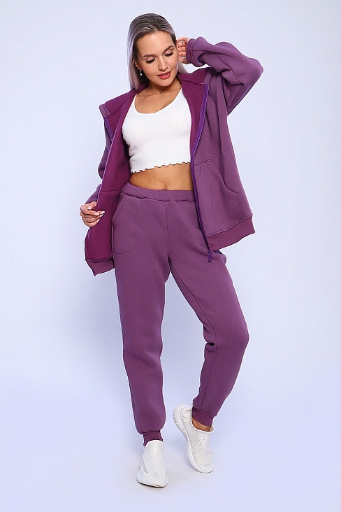 Женский костюм состоит из куртки на молнии с капюшоном и брюк. Женский брючный костюм из футера с начесом подходит для активного отдыха и прогулок прохладными вечерами.