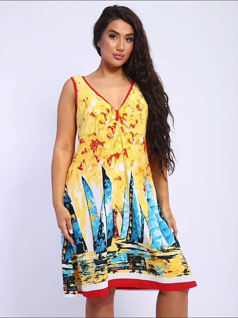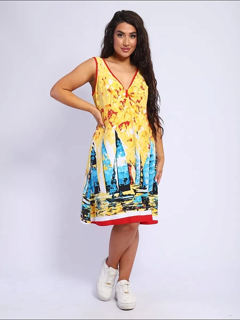 Женский легкий сарафан "Пляжный" с ярким принтом обязательно понравится любителям знойного лета. Сарафан подойдет как девушкам, так и женщинам. Легкий и удобный сарафан, длина подола - мини. Яркая красочная расцветка. Данное изделие выполнено из 100% хлопка.