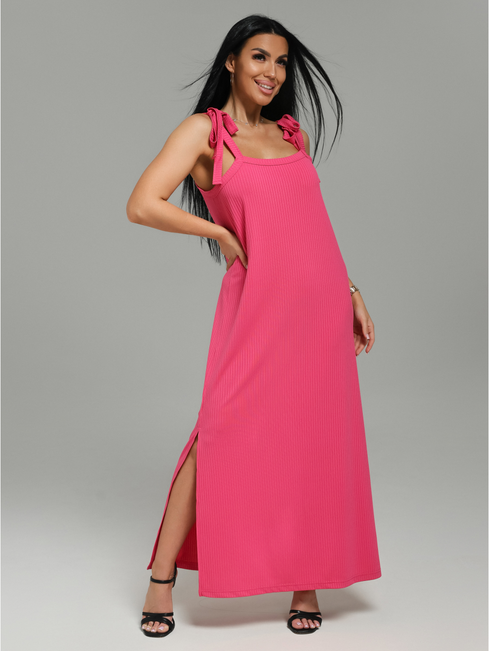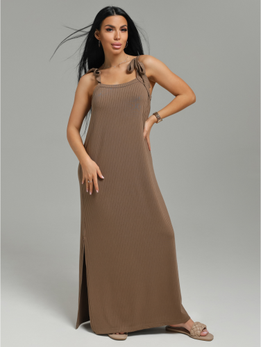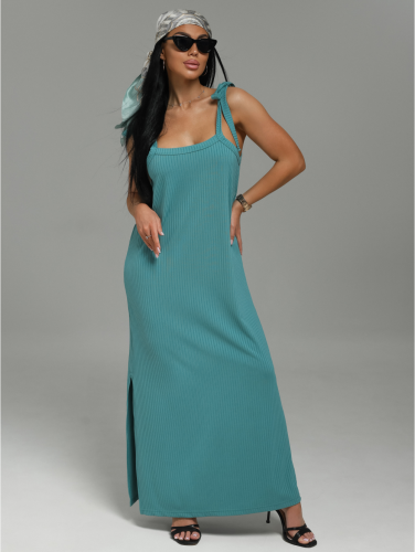 Сарафан женский Валенсия А-образного силуэта, длиной до щиколотки. Лямки сарафана представляют собой завязки из окантовки. В левом боковом шве разрез.
