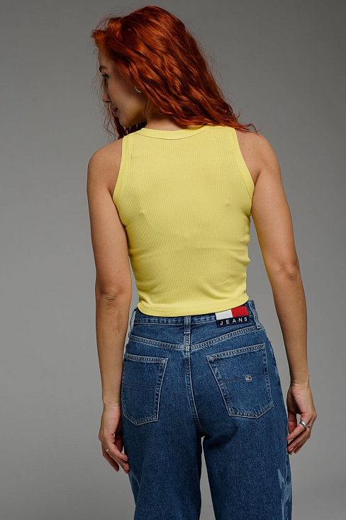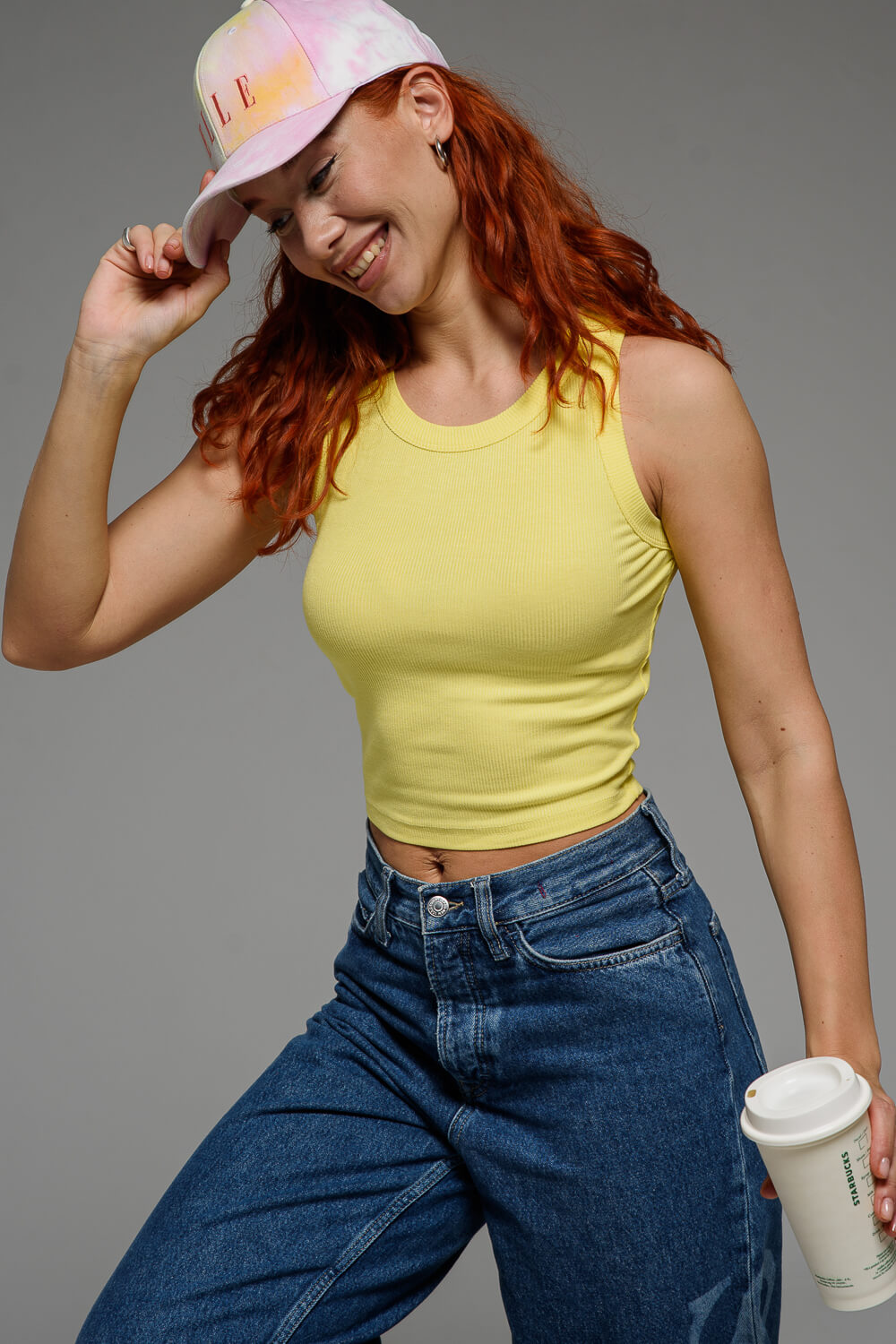 Базовый топ укороченной длины. Выполнен из фактурной ткани в рубчик из 100% полиэстера. Облегающий крой отлично садится по фигуре, подчеркивая её достоинства. Круглая горловина, широкие бретели, не просвечивает, топ максимально комфортный в носке.