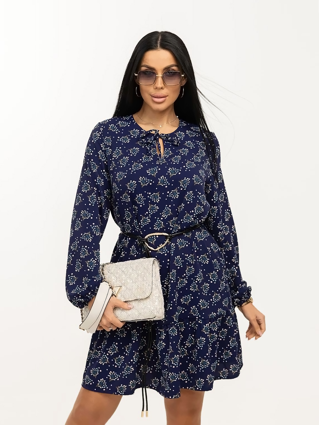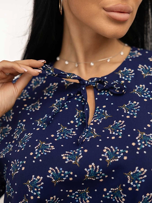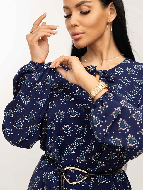 Женское платье мод.1707/11 / Синий из легкой ткани, свободного силуэта с воланом по низу изделия, длинным рукавом, округлой горловиной с завязками. Наше платье отлично будет смотреться как с кедами и сумкой кросс-боди, так и с туфлями на каблуке и широким ремнем.