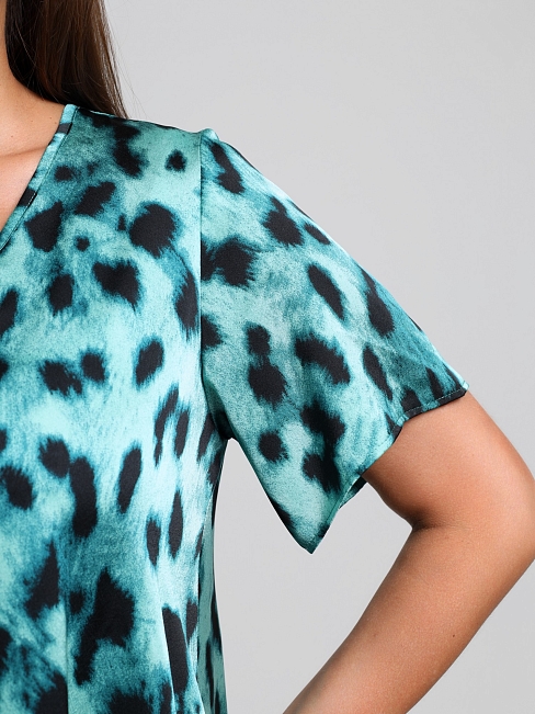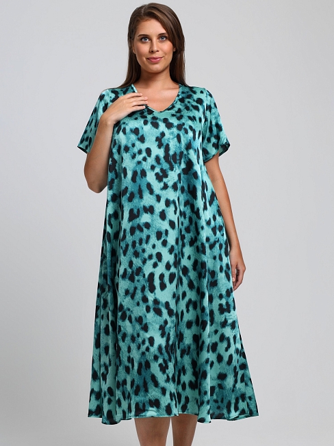 Платье женское из тканого полотна «искусственный шёлк полиэстер» с набивным рисунком, свободного покроя, удлиненное, по боковым швам расклешенное книзу, с V-образным вырезом горловины, окантованным основным материалом и короткими втачными рукавами.