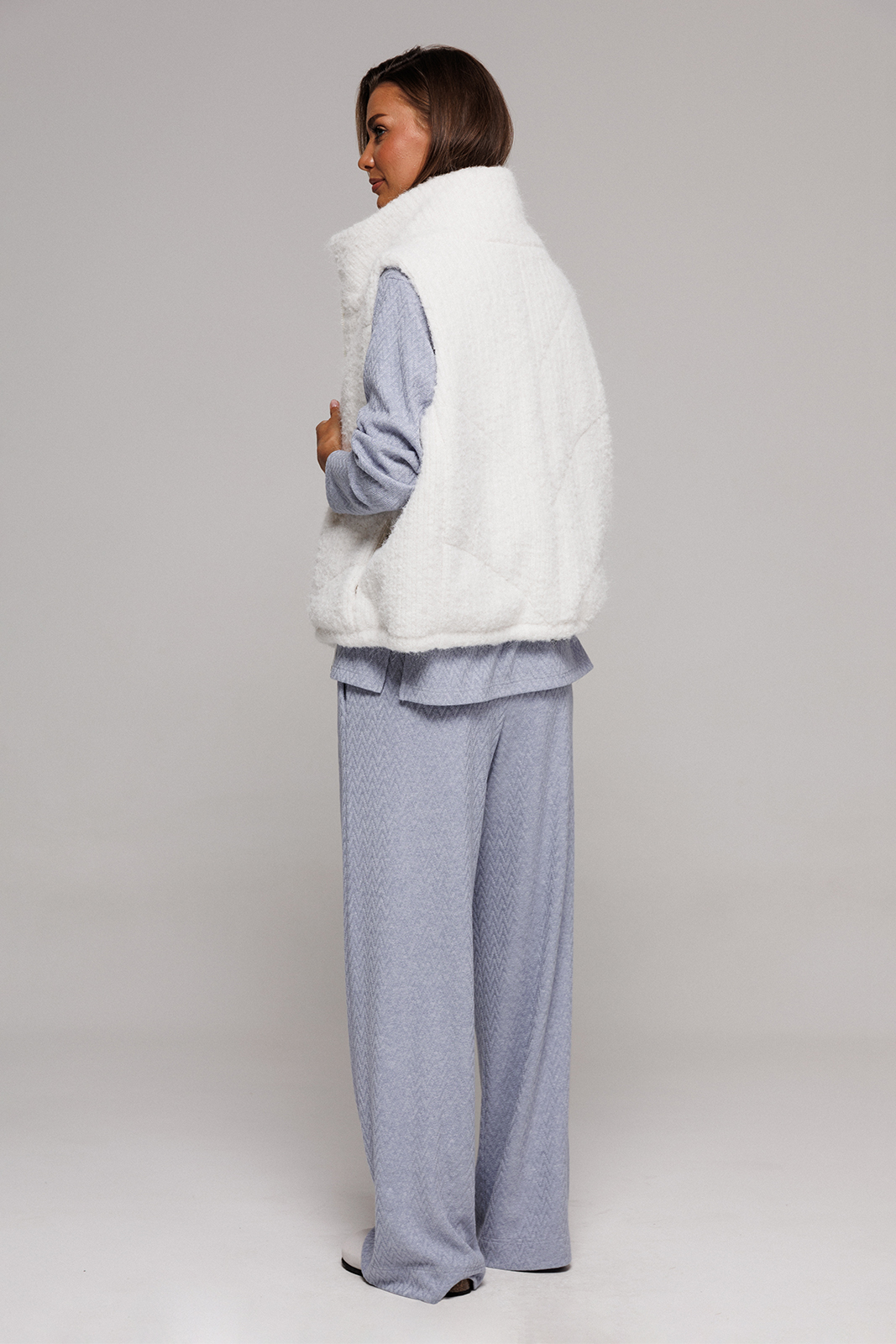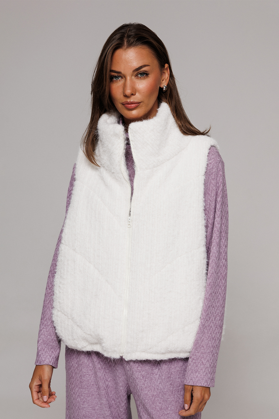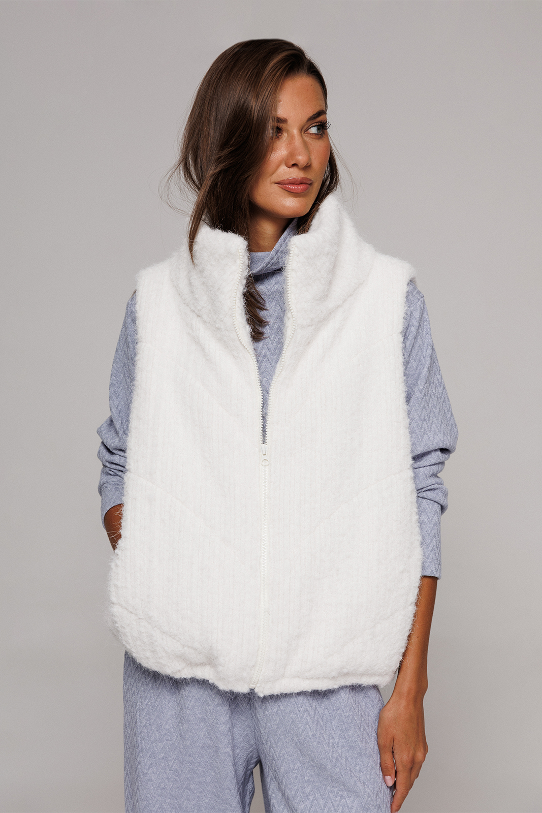 Жилет короткий свободного силуэта, слегка заужен к низу. Полочка с центральной застежкой на тесьму-молнию, с отрезным бочком и карманом в шве притачивания бочка. По низу жилета вставлена эластичная тесьма с фиксатором на спинке. Воротник - стойка. Жилет из трикотажного полотна с фигурной стежкой на синтепоне (isosoft 150г/м²) и подкладке. 60% ПЭ, 35% вискоза, 5% шерсть