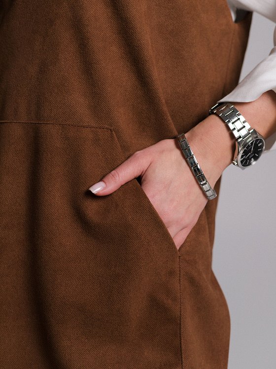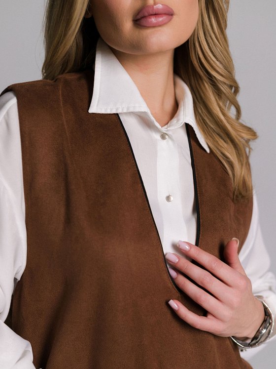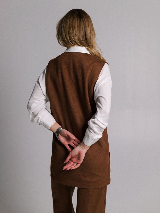Женский жилет выполнен из мягкого материала с фактурой "замша-диагональ". Модель имеет свободный прямой крой и V-образный вырез, который визуально вытягивает силуэт. Спереди расположен удобный накладной карман-кенгуру. По бокам внизу предусмотрены разрезы, которые добавляют комфорта в движении и подчёркивают актуальный дизайн. Удлинённая линия низа придаёт образу современный и завершённый вид.