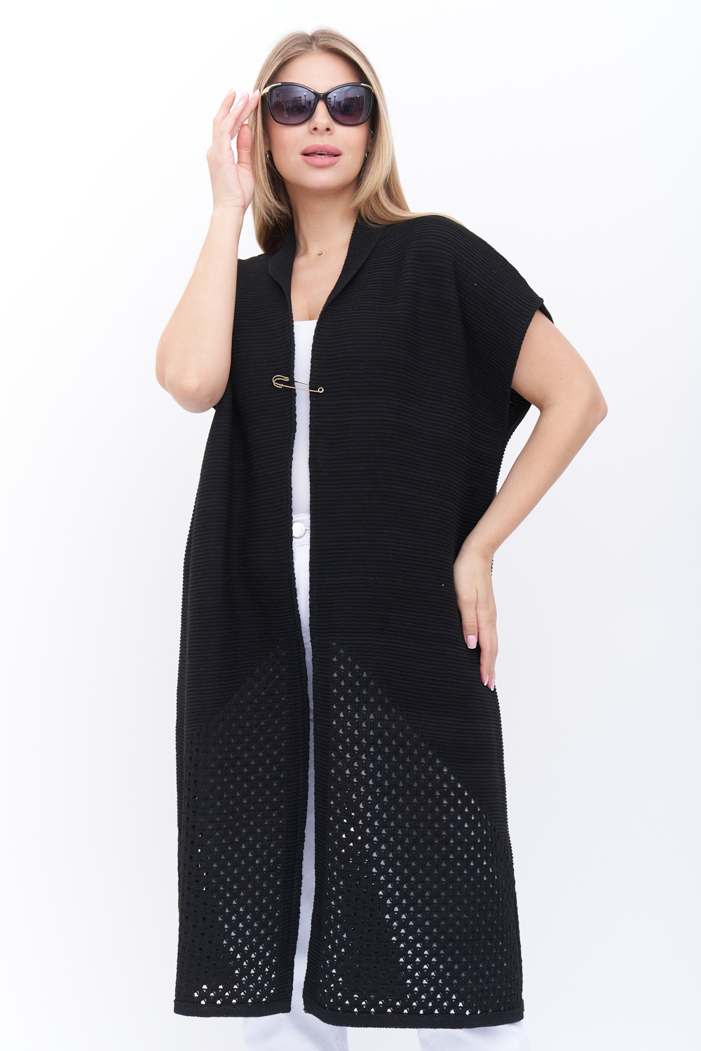 Нарядный женский вязаный жилет-накидка прямого силуэта. Небольшой воротник-шаль, застежка на декоративную булавку.  Оригинальный ажур по низу изделия. Состав изделия включает в себя 50% хлопка.