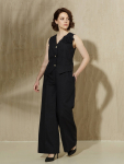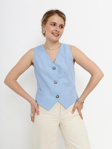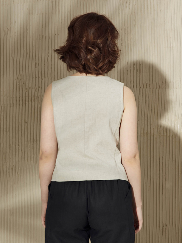 Женский жилет выполнен из легкой ткани, состоящей из 70% льна и 30% хлопка, что обеспечивает не такую выраженную сминаемость, как у 100% льна.