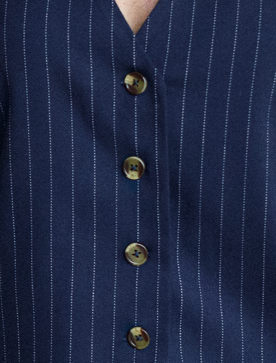 Жилет выполнен из костюмной ткани в полоску. Модель хорошо сидит по фигуре при этом не сковывает движений и подходит для любого типа фигуры. Можно носить как первый слой на тело или поверх футболки. Сочетается в костюме с брюками D24.252 и шортами D28.053 темно-синий