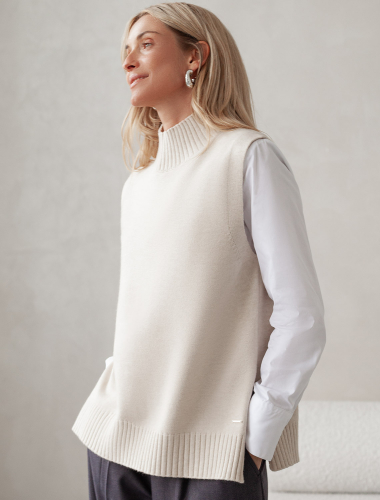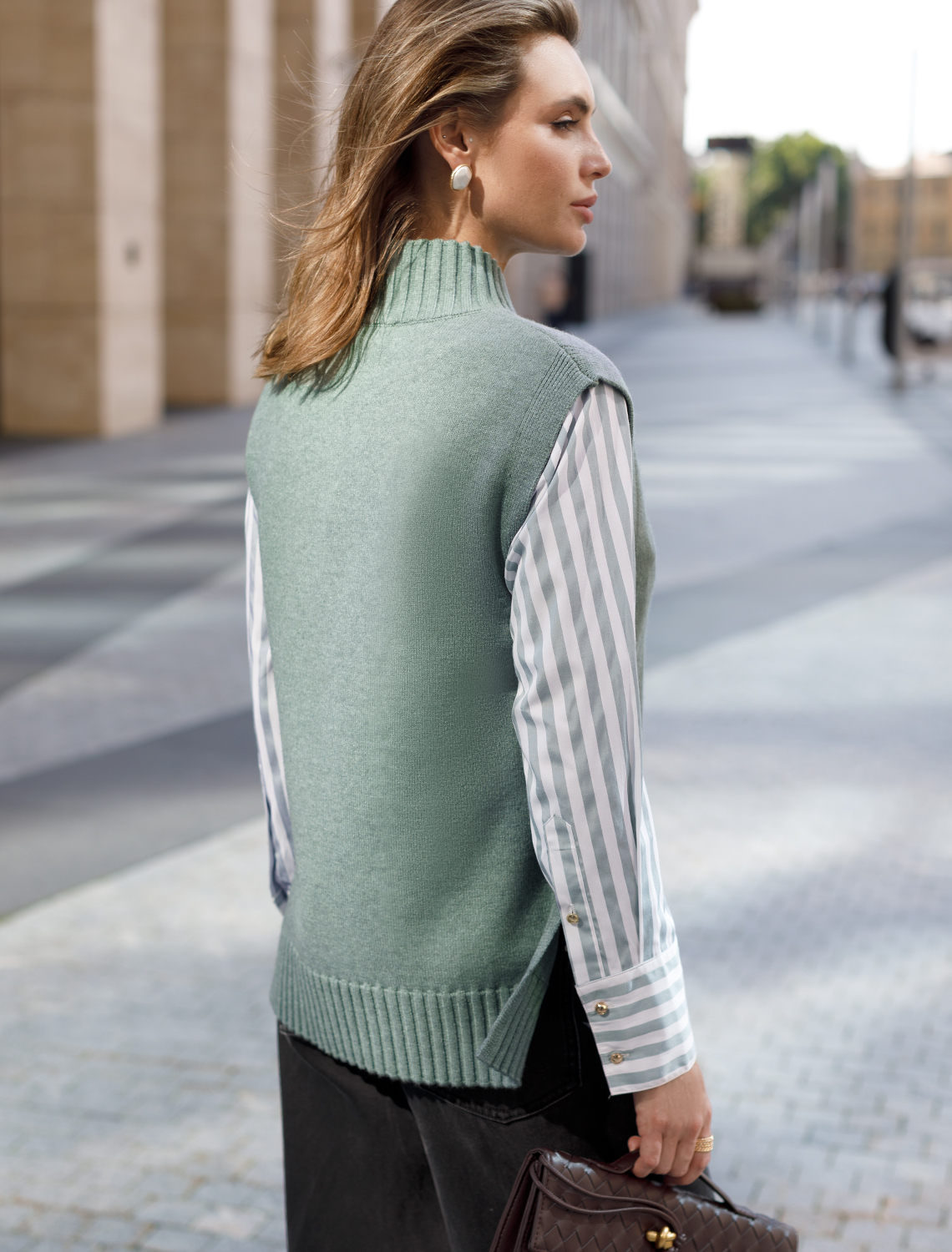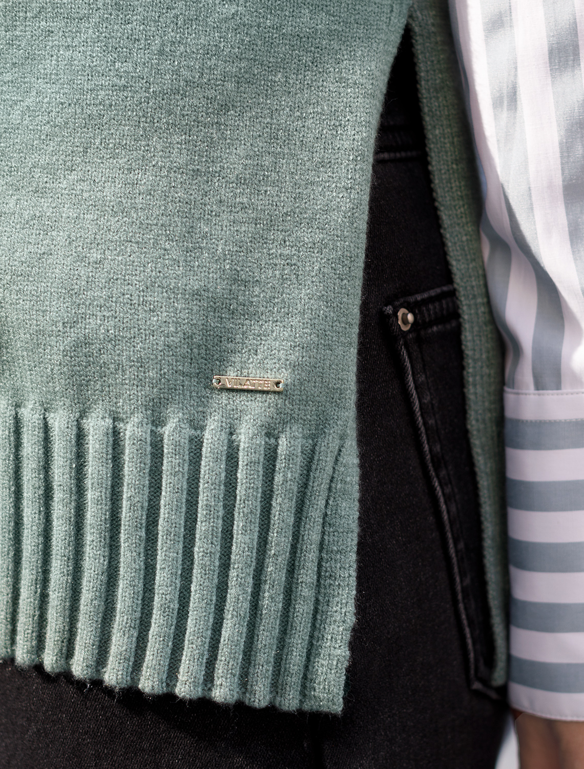 Жилет с воротом стойка выполнен из мягкой пряжи с кашемиром. Модель дополнена боковыми разрезами. Хорошо сочетается лонгсливами и блузками. Мягкая пряжа очень приятная к телу, поддержит комфорт на протяжении всего дня, при этом не перегревая. Сочетается в костюме с брюками D38.013, D38.012 и юбкой D36.016 светло-оливковый меланж
