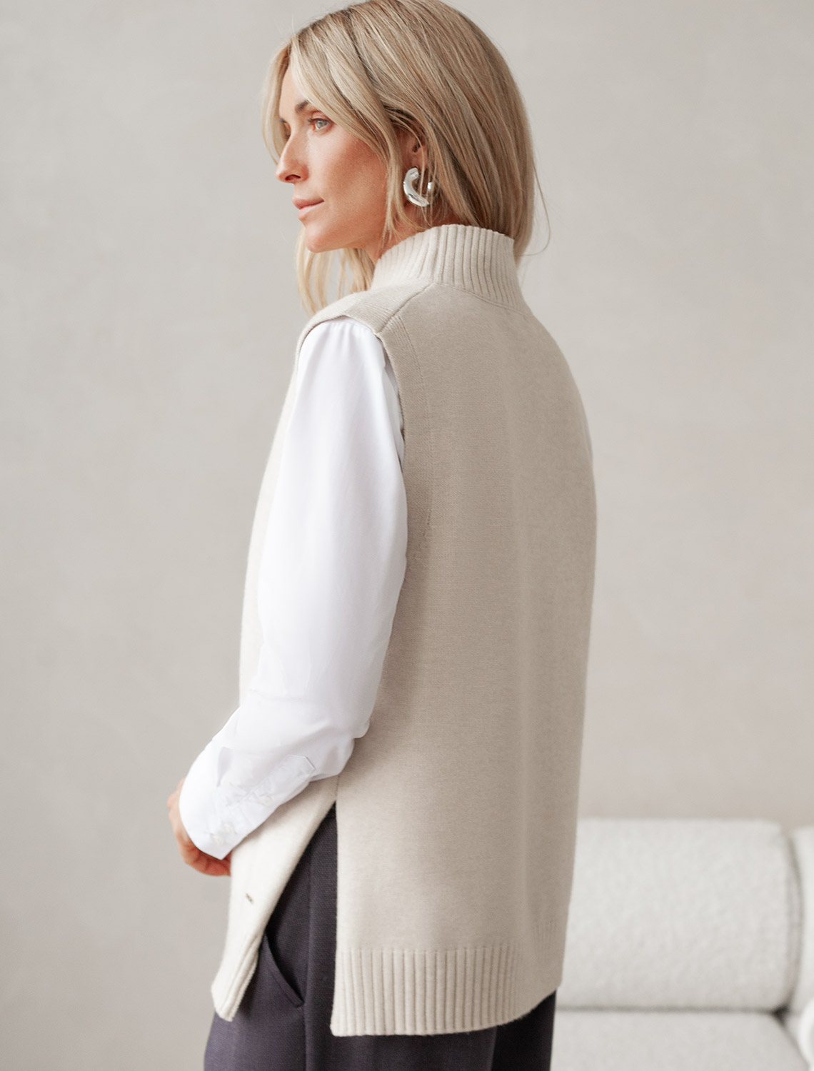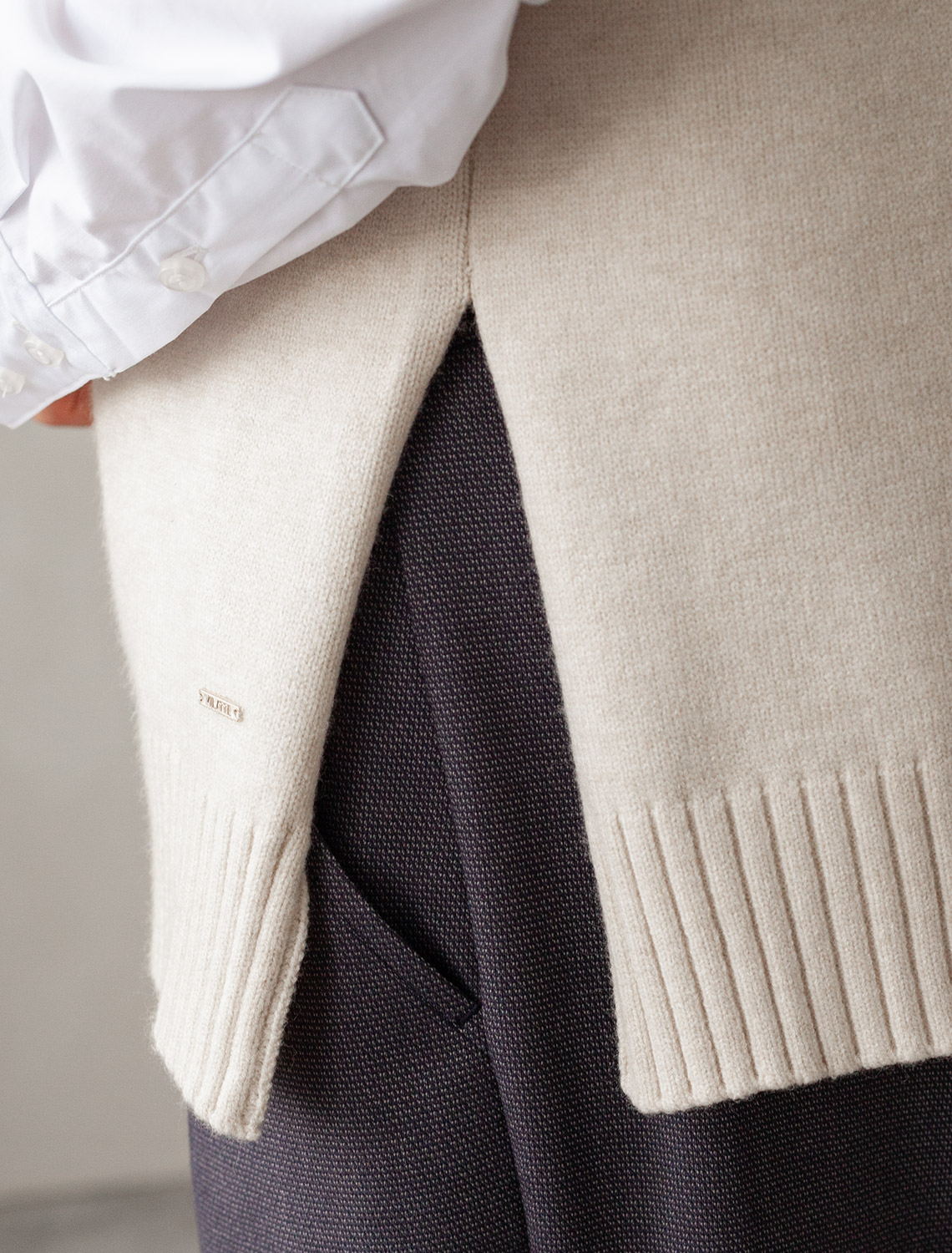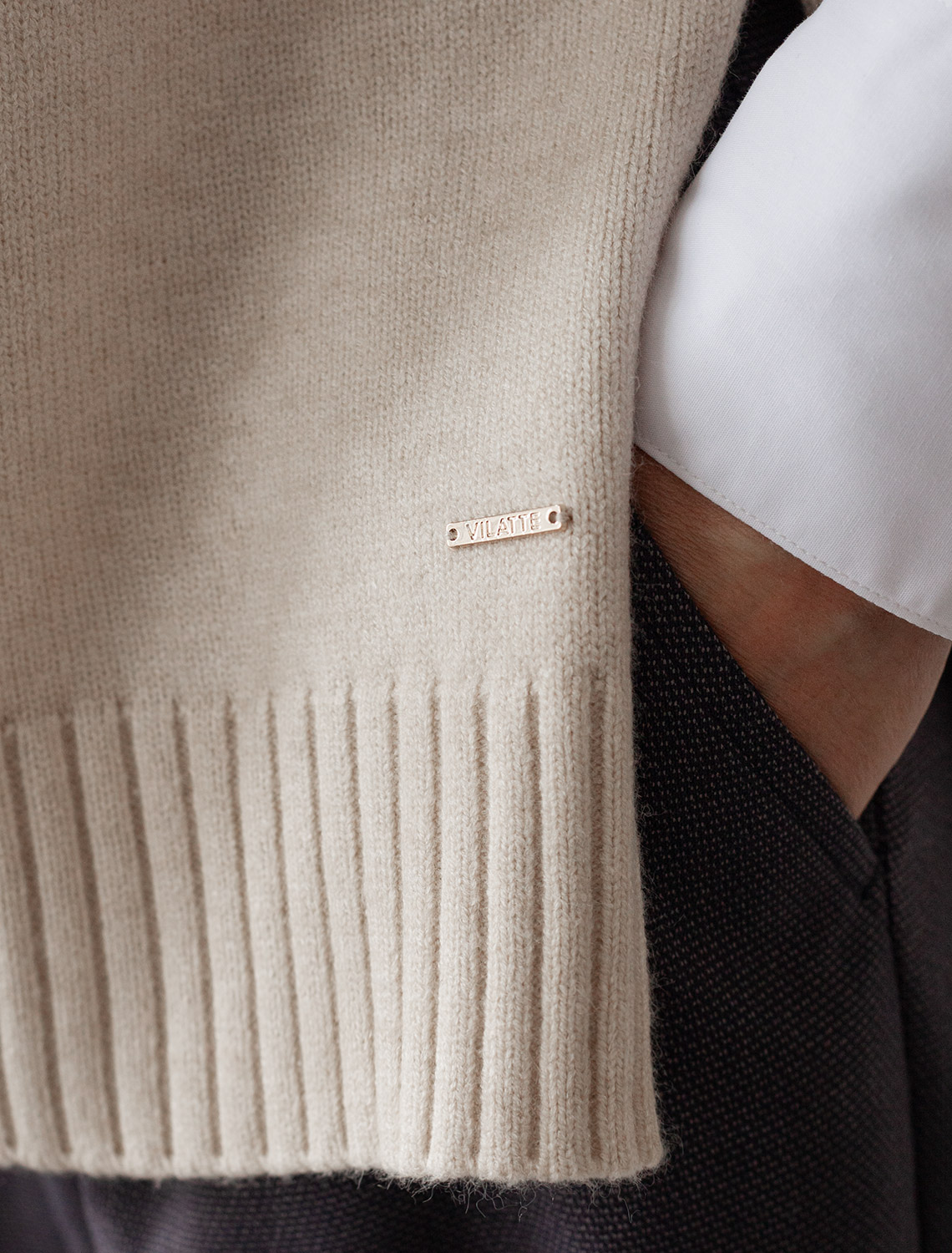 Жилет с воротом стойка выполнен из мягкой пряжи с кашемиром. Модель дополнена боковыми разрезами. Хорошо сочетается лонгсливами и блузками. Мягкая пряжа очень приятная к телу, поддержит комфорт на протяжении всего дня, при этом не перегревая. Сочетается в костюме с брюками D38.013, D38.012 и юбкой D36.016 овсяный меланж