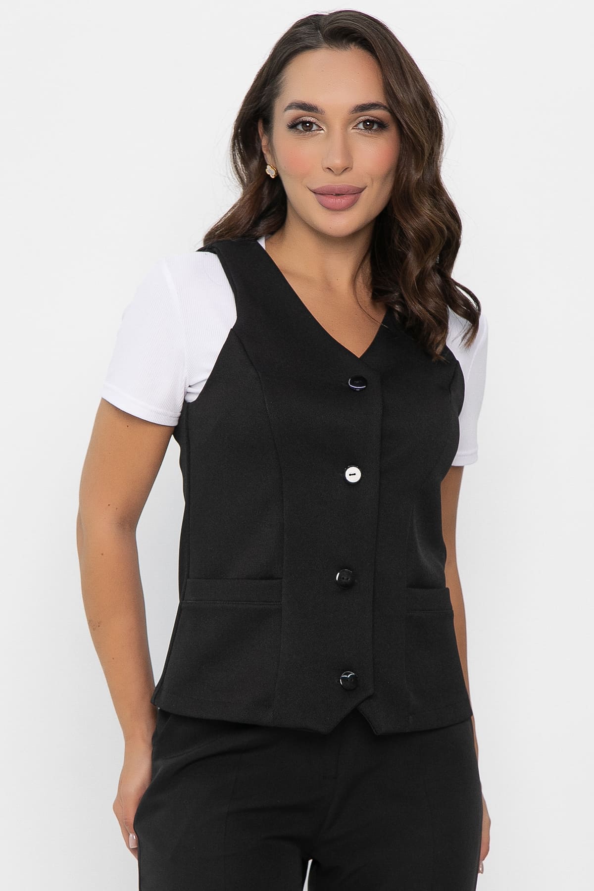 Добавьте в свой гардероб стильную чёрную жилетку, которая станет эффектным элементом вашего образа. Эта модель классического кроя с приталенным силуэтом и V-образным вырезом выглядит элегантно. Жилетка имеет карманы, что делает её ещё более практичной. Благодаря своей универсальности, жилетка отлично сочетается с различными топами, блузками и брюками, позволяя создавать разнообразные стильные образы. Подчеркните свою индивидуальность и изысканность с этой элегантной жилеткой!