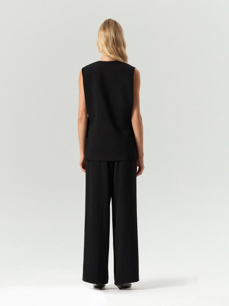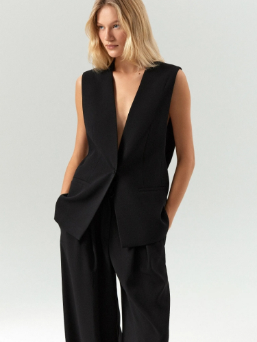 Чёрный жилет прямого кроя для эффектных деловых и повседневных образов, а также образов к особому случаю. Удлинённая модель на одной пуговице имеет трендовый глубокий V-вырез и углублённые проймы, что делает её оригинальнее и удобнее для создания многослойных образов. Изделие выполнено из материала с высоким содержанием вискозы, на подкладке. Дополнить жилет можно брюками или другим низом из комплекта, блузами и рубашками