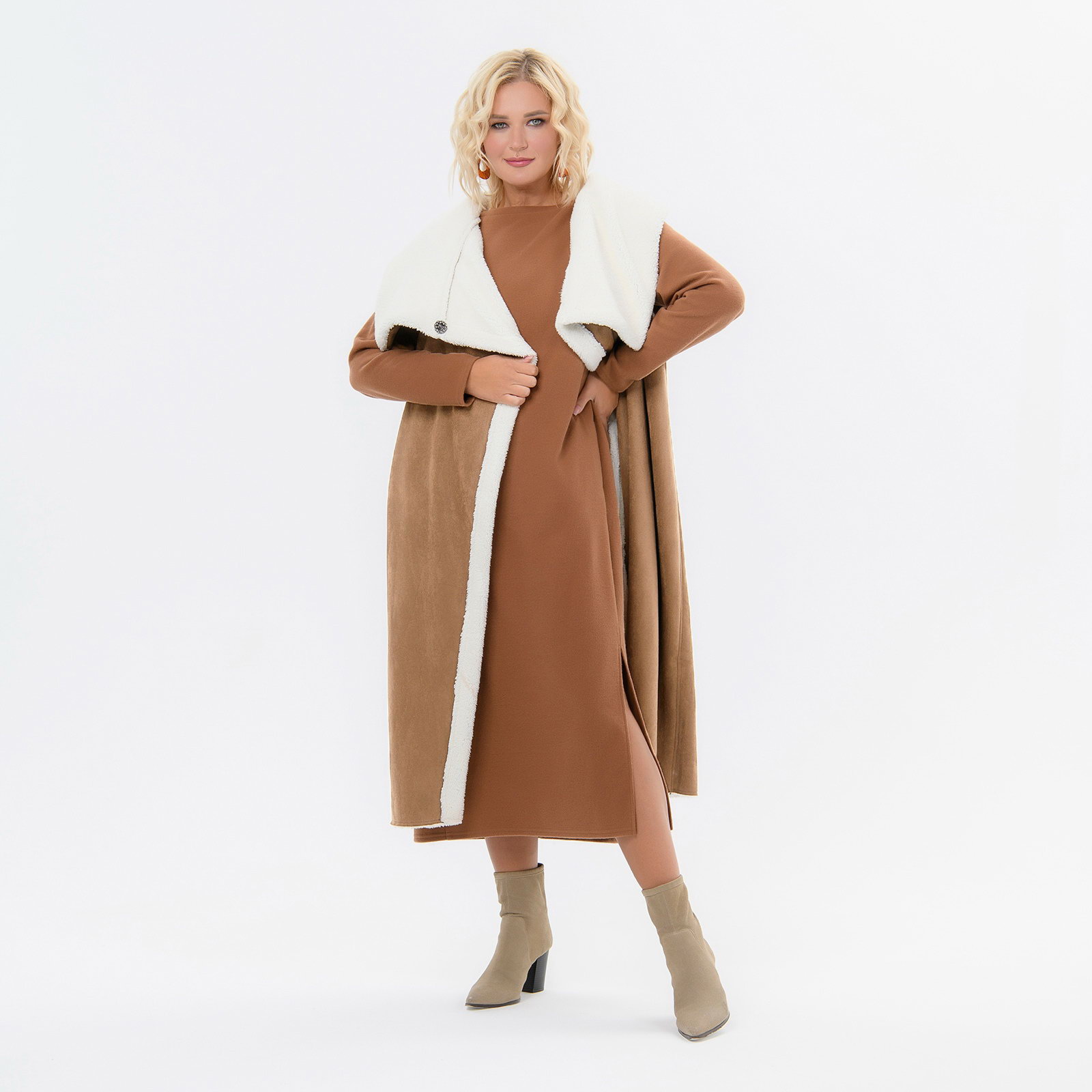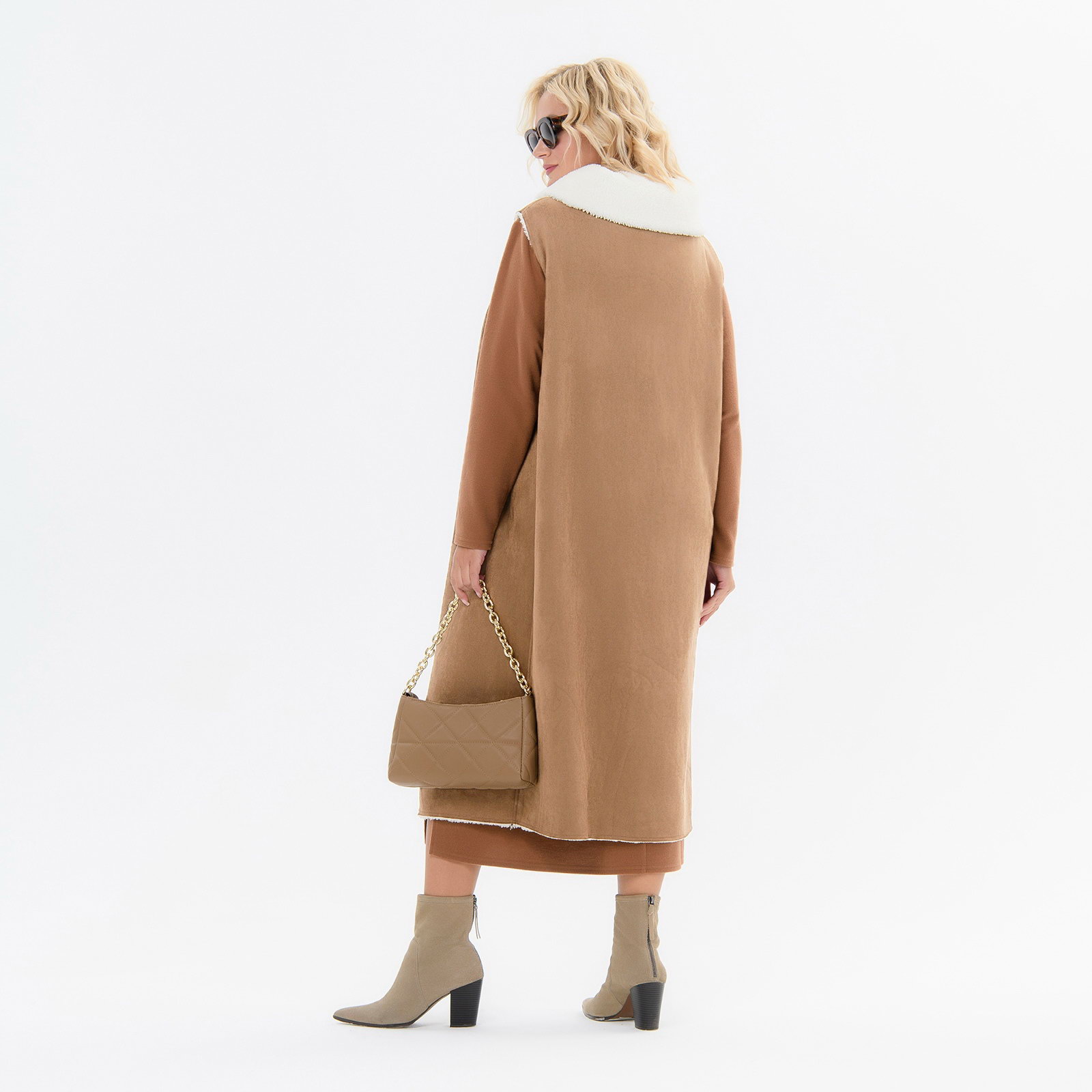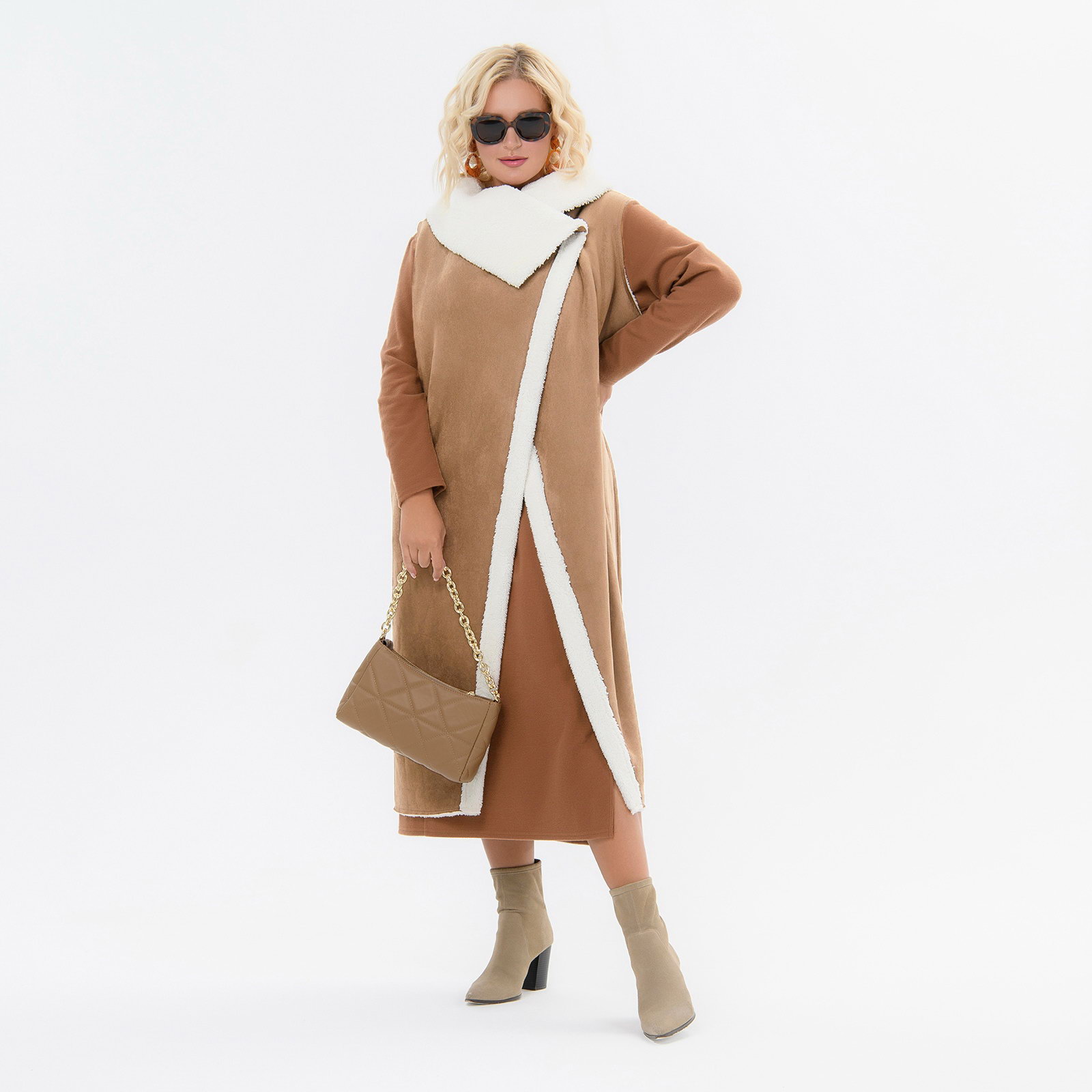Жилет удлиненный из экомеха "дубленка", с косой линией борта, цвет "карамель"
