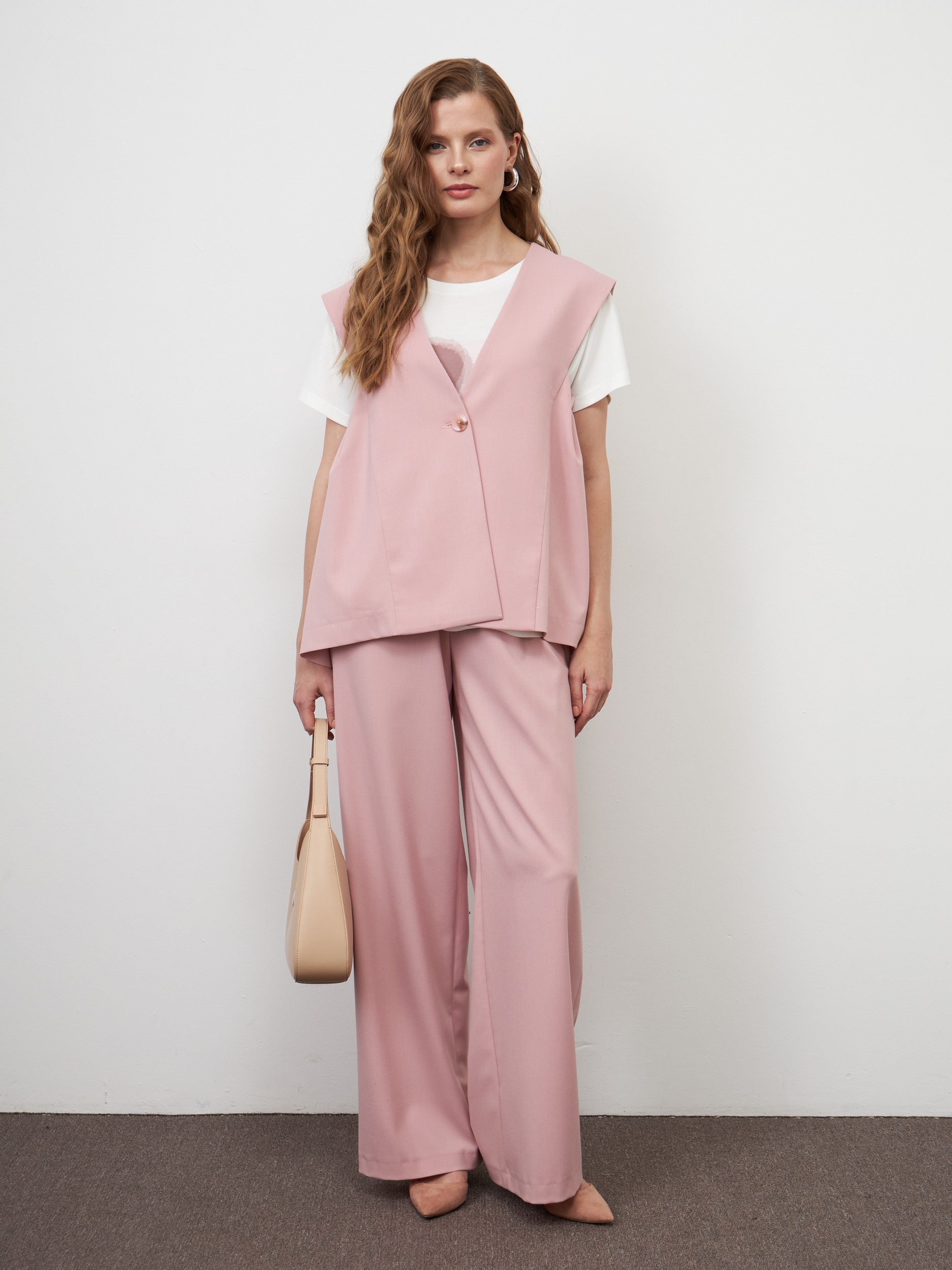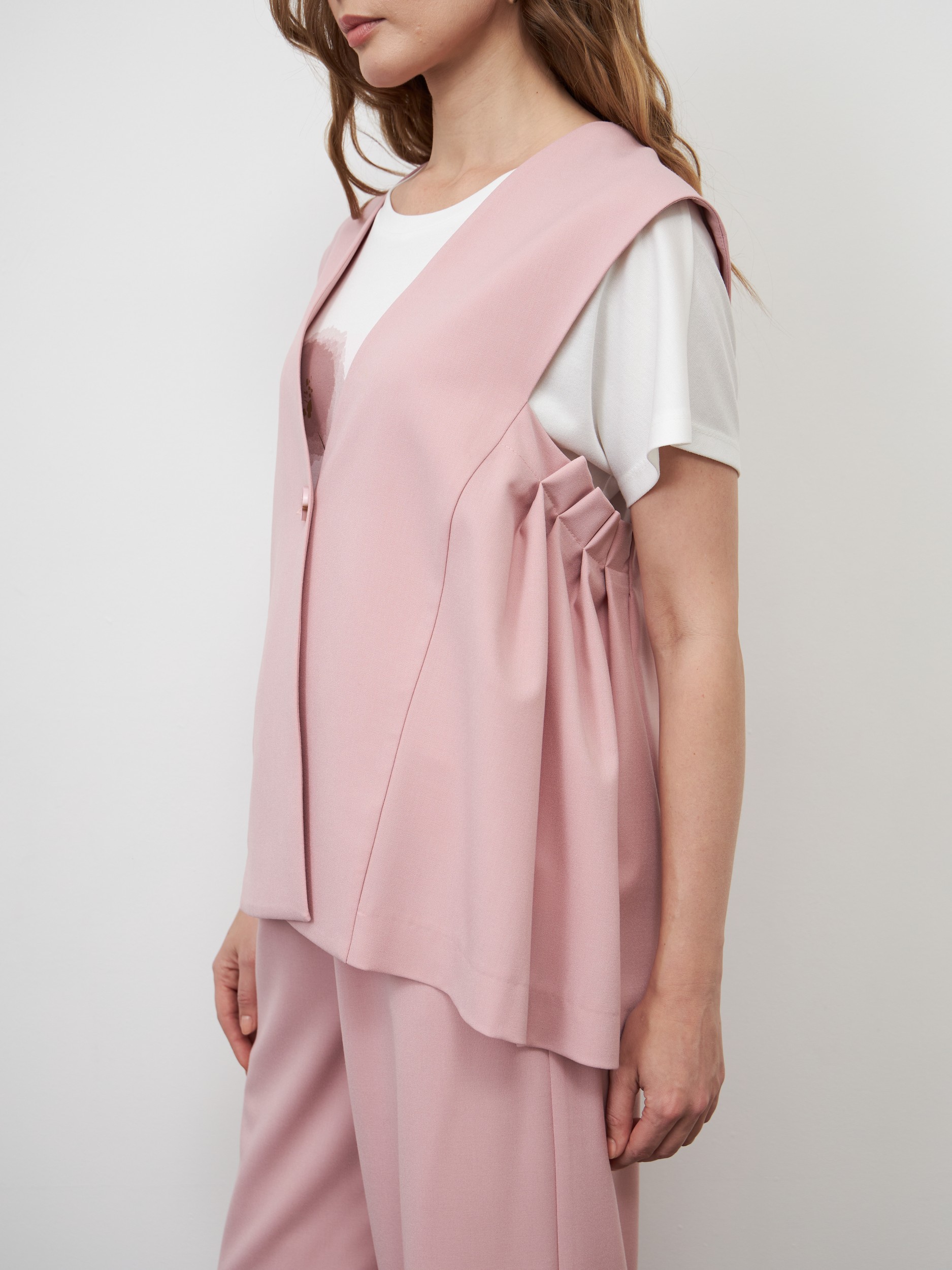 Жилет нежного розового цвета, свободного кроя с низкой проймой и расширенными плечами, сшили из мягкого легкого материала, который поддерживает комфортный микроклимат и не деформируется со временем. Изделие с застежкой на одну пуговицу, без подкладки, декорировали глубокими складками по бокам. Такая вещь станет акцентом в весеннем образе и позволит создать офисные аутфиты поверх привычных футболок и блузок. На фото в паре Брюки Б-900 РВЕ(В5) и Блузка Д-601 РЖЕ(В5).