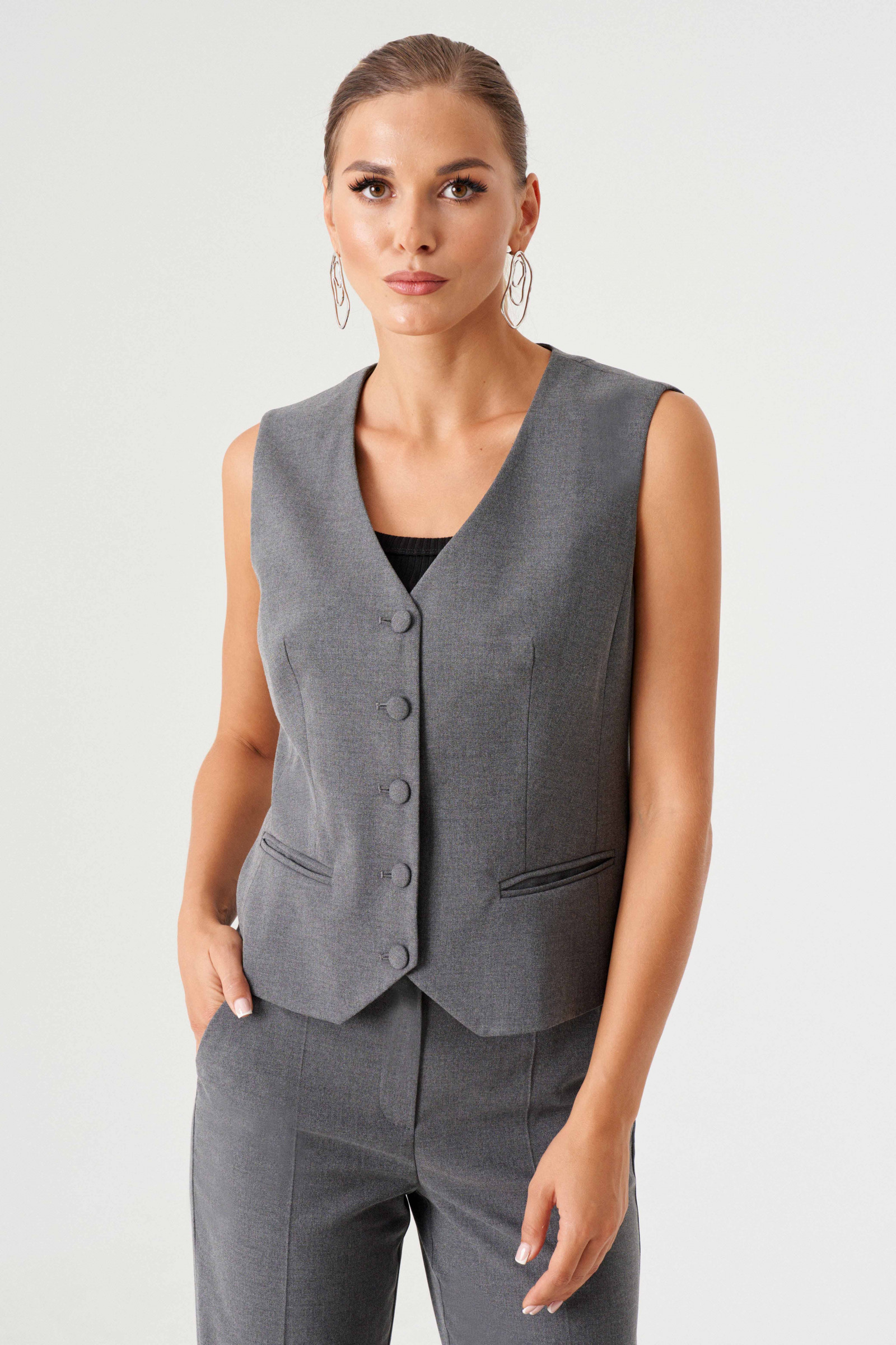Жилет женский в классическом стиле - современная база женского гардероба. Классический жилет выполнен из костюмной ткани с V-образным вырезом, полуприлегающего кроя, подходит для образов в офис, в университет, в школу, на каждый день. Жилетка короткая на пуговицах имеет подкладку из вискозы, ее можно надевать под пиджак как первый слой (тренд сезона), под кардиган, а также сочетать с шелковыми топами, блузками женскими, водолазками, рубашками. Дополни жилеткой классическую прямую юбку, юбку мини, женские прямые брюки или брюки палаццо и даже джинсы!